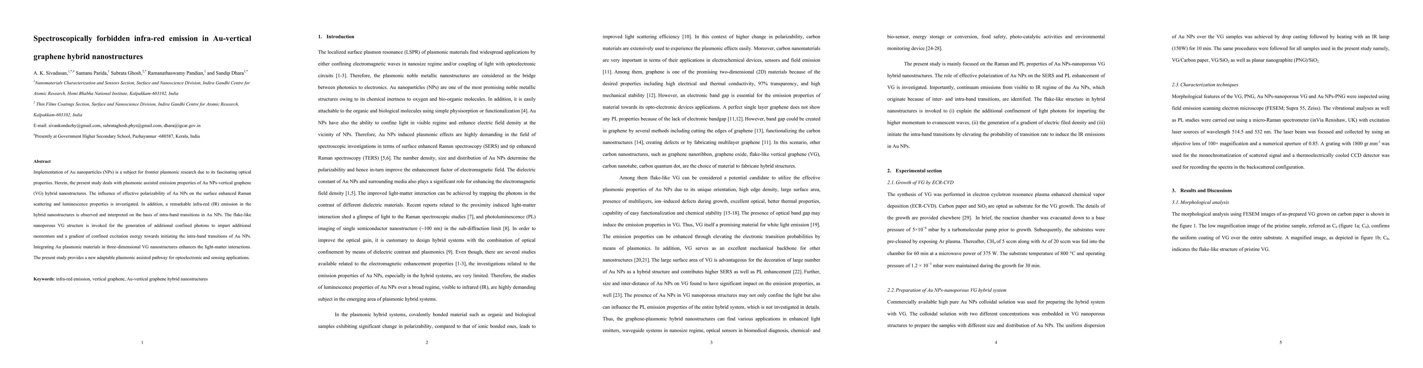 This study investigates the plasmonic-assisted emission properties of Au nanoparticles integrated with vertical graphene, revealing spectroscopically forbidden infra-red emission due to intra-band transitions in Au NPs. The enhanced light-matter interactions in three-dimensional nanostructures suggest potential for optoelectronic and sensing applications.