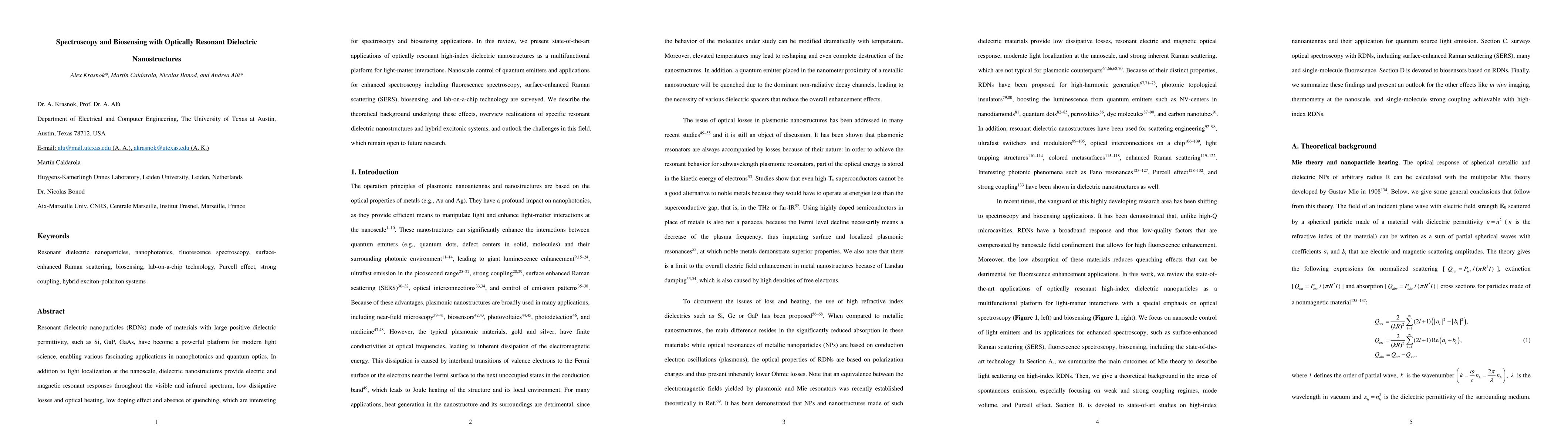 This paper reviews the use of optically resonant dielectric nanoparticles for advanced spectroscopy and biosensing applications, highlighting their nanoscale light-matter interaction capabilities, including fluorescence and SERS enhancement, and discussing theoretical foundations and future research challenges.