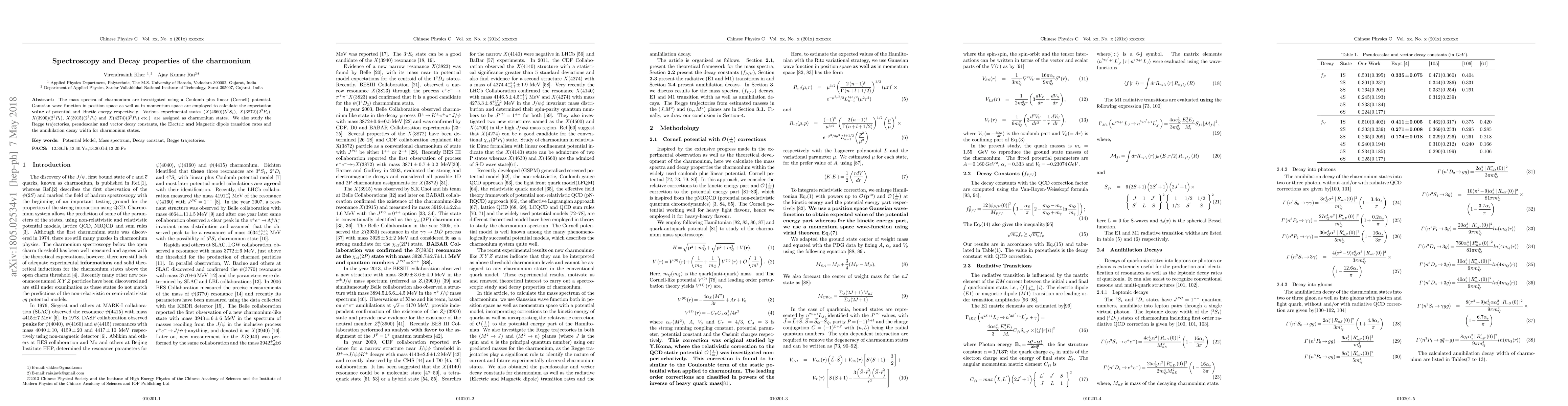 The mass spectra of charmonium are investigated using a Coulomb plus linear (Cornell) potential. Gaussian wave function in position space as well as in momentum space are employed to calculate the expectation value of potential and kinetic energy respectively. Various experimental states ($X(4660)(5^{3}S_{1})$, $X(3872)(2^{3}P_{1})$, $X(3900)(2^{1}P_{1})$, $X(3915)(2^{3}P_{0})$ and $X(4274)(3^{3}P_{1})$ etc.) are assigned as charmonium states. We also study the Regge trajectories, pseudoscalar and vector decay constants, the Electric and Magnetic dipole transition rates and the annihilation decay width for charmonium states.