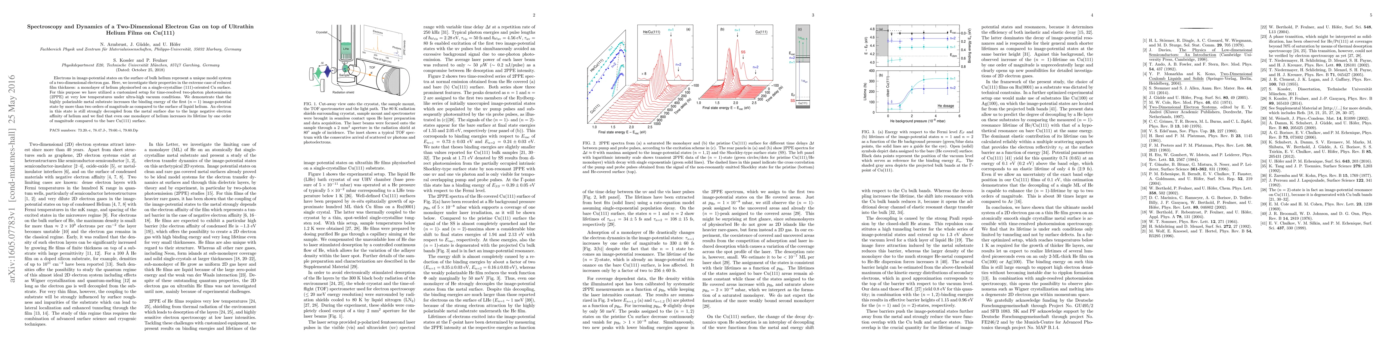 This study investigates the spectroscopy and dynamics of two-dimensional electron gas in a monolayer of helium on Cu(111) using time-resolved two-photon photoemission. The results show that the metal substrate significantly enhances the binding energy of the first image-potential state, while the helium layer increases the electron's lifetime by an order of magnitude.