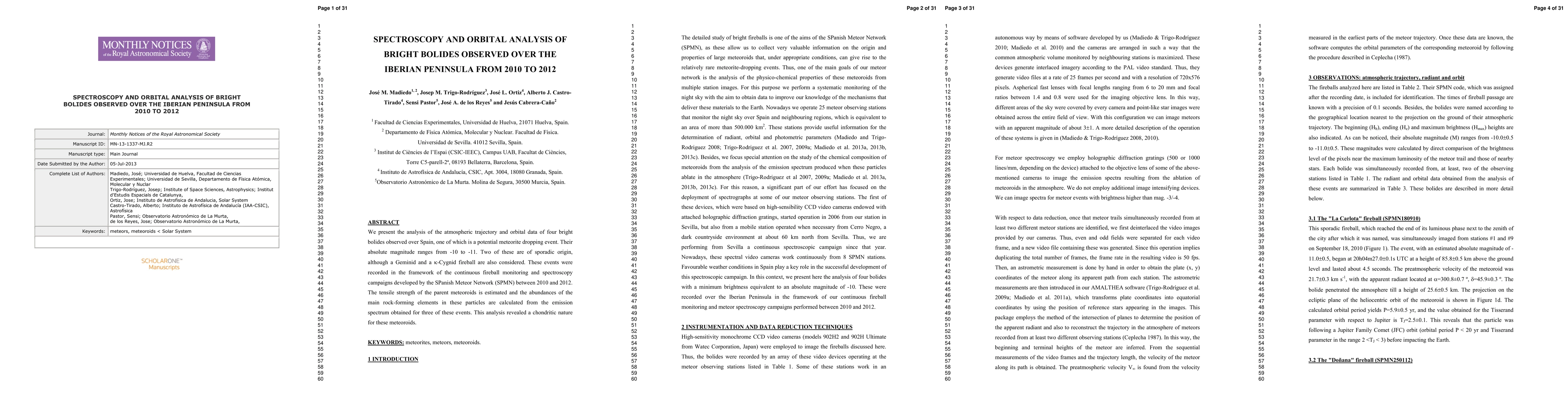 We present the analysis of the atmospheric trajectory and orbital data of four bright bolides observed over Spain, one of which is a potential meteorite dropping event. Their absolute magnitude ranges from -10 to -11. Two of these are of sporadic origin, although a Geminid and a kappa-Cygnid fireball are also considered. These events were recorded in the framework of the continuous fireball monitoring and spectroscopy campaigns developed by the SPanish Meteor Network (SPMN) between 2010 and 2012. The tensile strength of the parent meteoroids is estimated and the abundances of the main rock-forming elements in these particles are calculated from the emission spectrum obtained for three of these events. This analysis revealed a chondritic nature for these meteoroids.