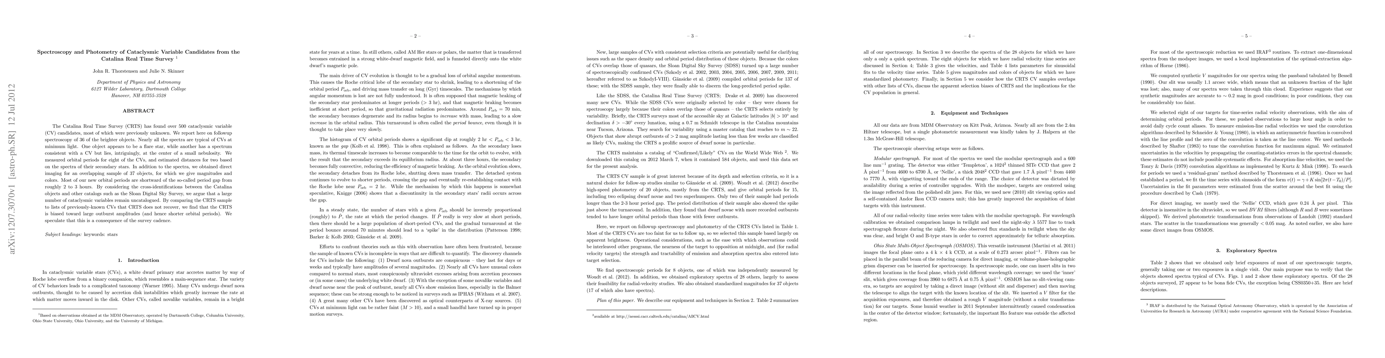 The Catalina Real Time Survey (CRTS) has found over 500 cataclysmic variable (CV) candidates, most of which were previously unknown. We report here on followup spectroscopy of 36 of the brighter objects. Nearly all the spectra are typical of CVs at minimum light. One object appears to be a flare star, while another has a spectrum consistent with a CV but lies, intriguingly, at the center of a small nebulosity. We measured orbital periods for eight of the CVs, and estimated distances for two based on the spectra of their secondary stars. In addition to the spectra, we obtained direct imaging for an overlapping sample of 37 objects, for which we give magnitudes and colors. Most of our new orbital periods are shortward of the so-called period gap from roughly 2 to 3 hours. By considering the cross-identifications between the Catalina objects and other catalogs such as the Sloan Digital Sky Survey, we argue that a large number of cataclysmic variables remain uncatalogued. By comparing the CRTS sample to lists of previously-known CVs that CRTS does not recover, we find that the CRTS is biased toward large outburst amplitudes (and hence shorter orbital periods). We speculate that this is a consequence of the survey cadence.