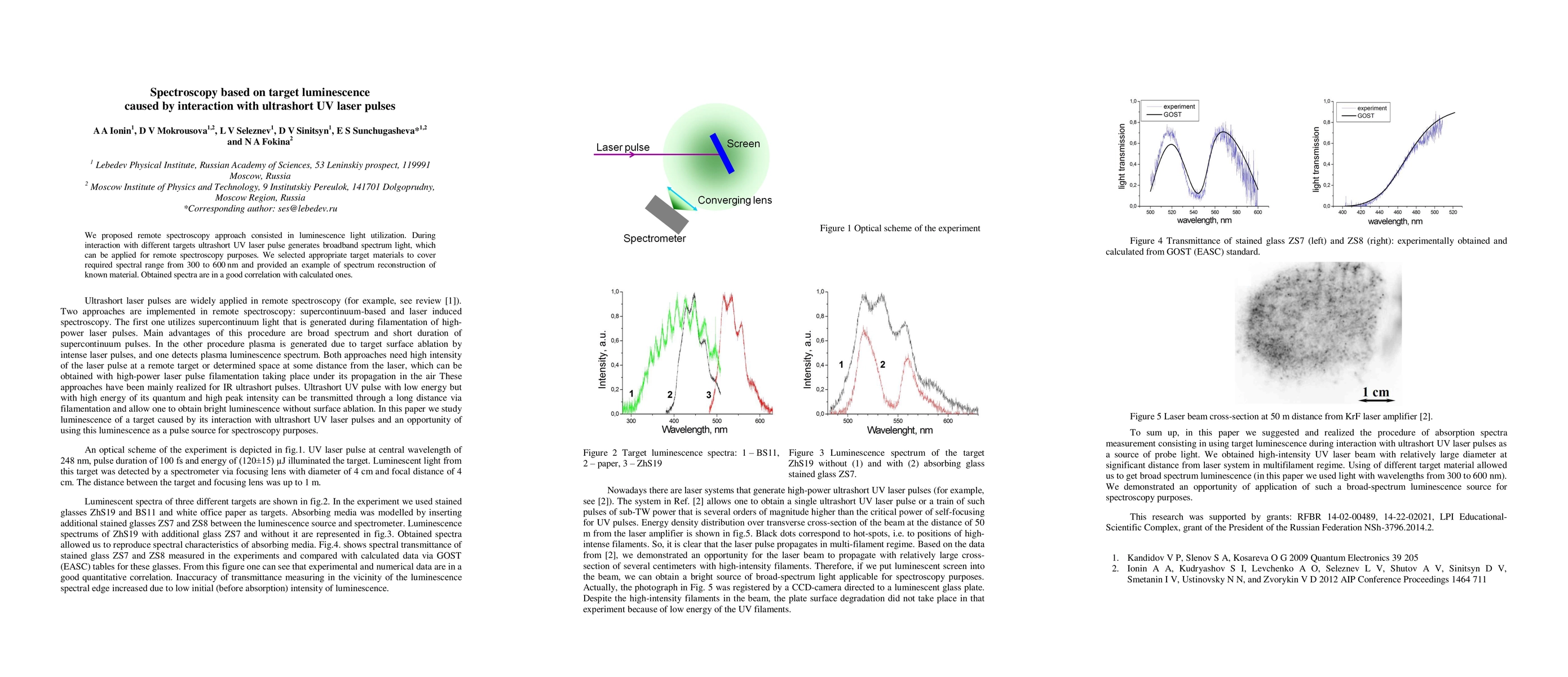 We proposed remote spectroscopy approach consisted in luminescence light utilization. During interaction with different targets ultrashort UV laser pulse generates broadband spectrum light, which can be applied for remote spectroscopy purposes. We selected appropriate target materials to cover required spectral range from 300 to 600 nm and provided an example of spectrum reconstruction of known material. Obtained spectra are in a good correlation with calculated ones.