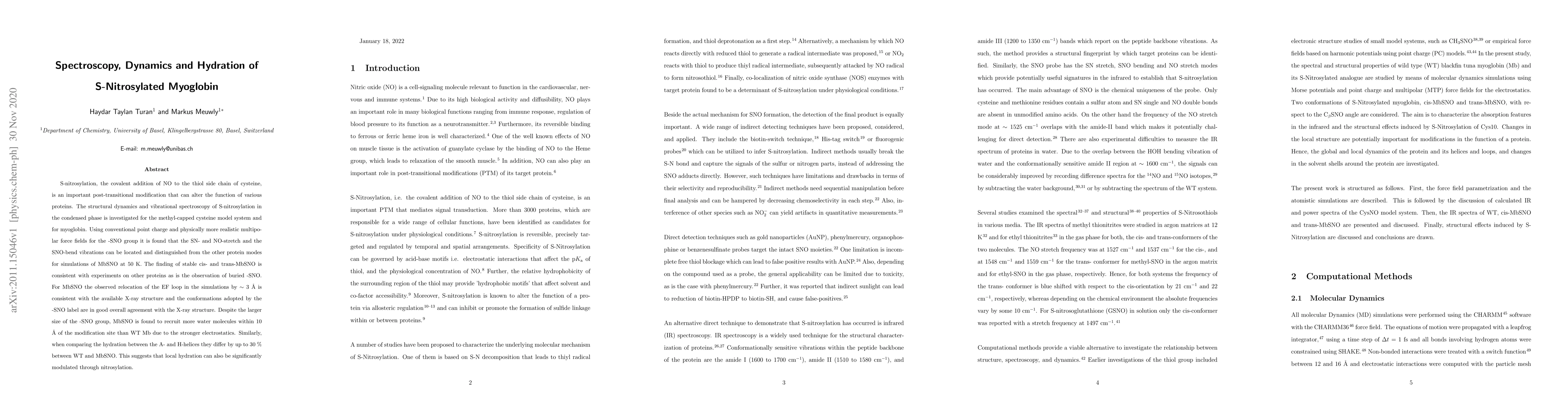 Researchers studied S-nitrosylated myoglobin using spectroscopy and simulations, finding that nitrosylation alters protein dynamics and hydration patterns, with the modification site recruiting more water molecules due to stronger electrostatics.