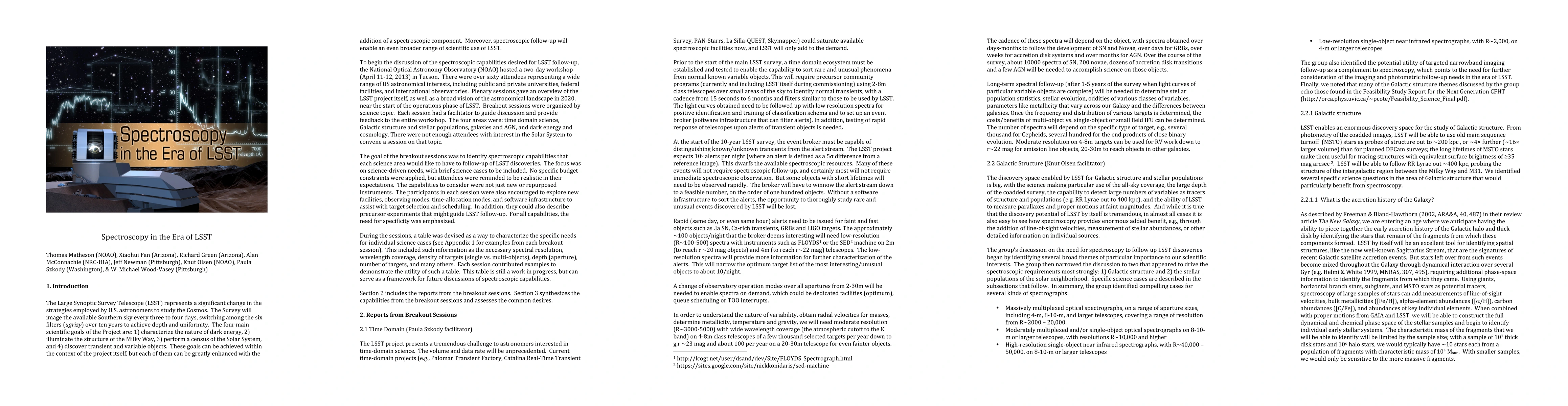 This report synthesizes discussions from the 'Spectroscopy in the Era of LSST' workshop, focusing on time domain science, Galactic structure, galaxies and AGN, and dark energy, to outline desired spectroscopic capabilities for future astronomical research. It provides a framework for characterizing specific science case needs.
