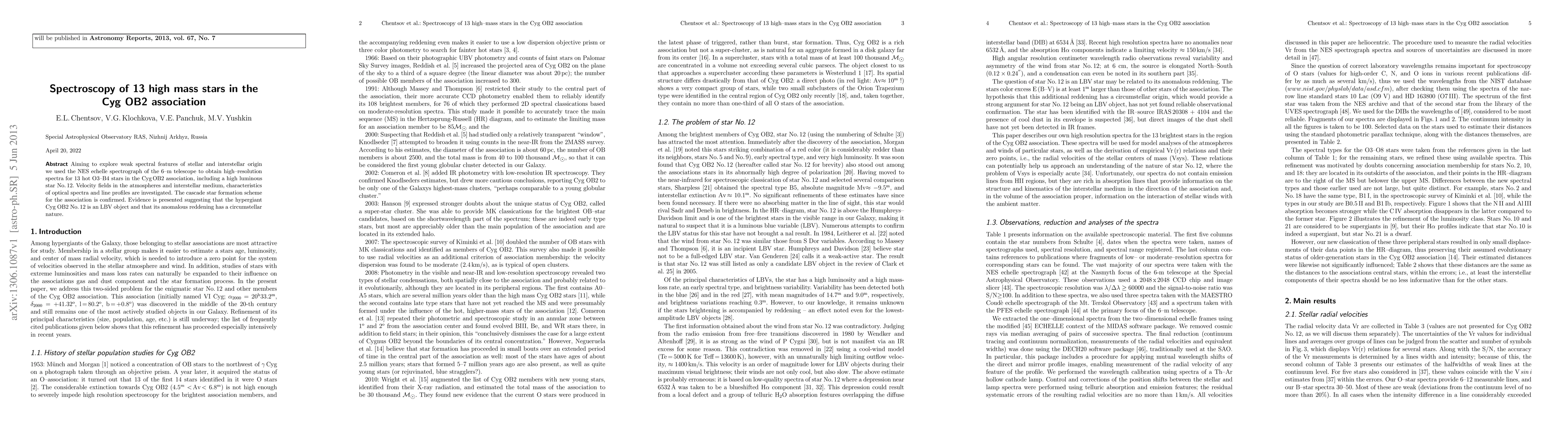 This study uses high-resolution spectroscopy to analyze 13 high mass stars in the Cyg OB2 association, confirming a cascade star formation scheme and identifying Cyg OB2 No. 12 as likely a Luminous Blue Variable (LBV) with circumstellar anomalous reddening. The research investigates spectral features, velocity fields, and interstellar medium characteristics.