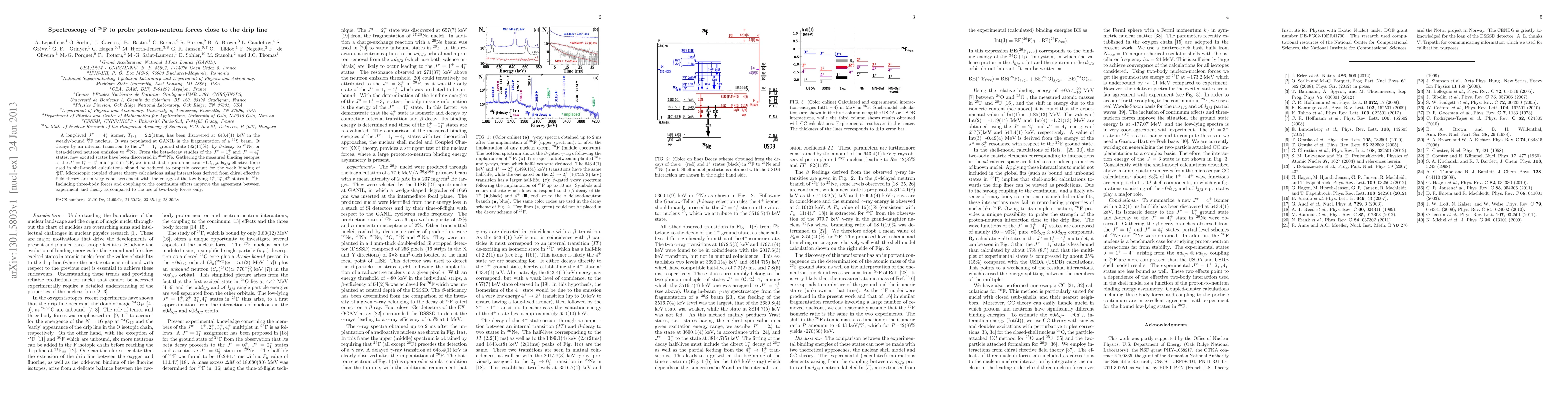 A long-lived $J^{\pi}=4_1^+$ isomer, $T_{1/2}=2.2(1)$ms, has been discovered at 643.4(1) keV in the weakly-bound $^{26}_{9}$F nucleus. It was populated at GANIL in the fragmentation of a $^{36}$S beam. It decays by an internal transition to the $J^{\pi}=1_1^+$ ground state (82(14)%), by $\beta$-decay to $^{26}$Ne, or beta-delayed neutron emission to $^{25}$Ne. From the beta-decay studies of the $J^{\pi}=1_1^+$ and $J^{\pi}=4_1^+$ states, new excited states have been discovered in $^{25,26}$Ne. Gathering the measured binding energies of the $J^{\pi}=1_1^+-4_1^+$ multiplet in $^{26}_{9}$F, we find that the proton-neutron $\pi 0d_{5/2} \nu 0d_{3/2}$ effective force used in shell-model calculations should be reduced to properly account for the weak binding of $^{26}_{9}$F. Microscopic coupled cluster theory calculations using interactions derived from chiral effective field theory are in very good agreement with the energy of the low-lying $1_1^+,2_1^+,4_1^+$ states in $^{26}$F. Including three-body forces and coupling to the continuum effects improve the agreement between experiment and theory as compared to the use of two-body forces only.