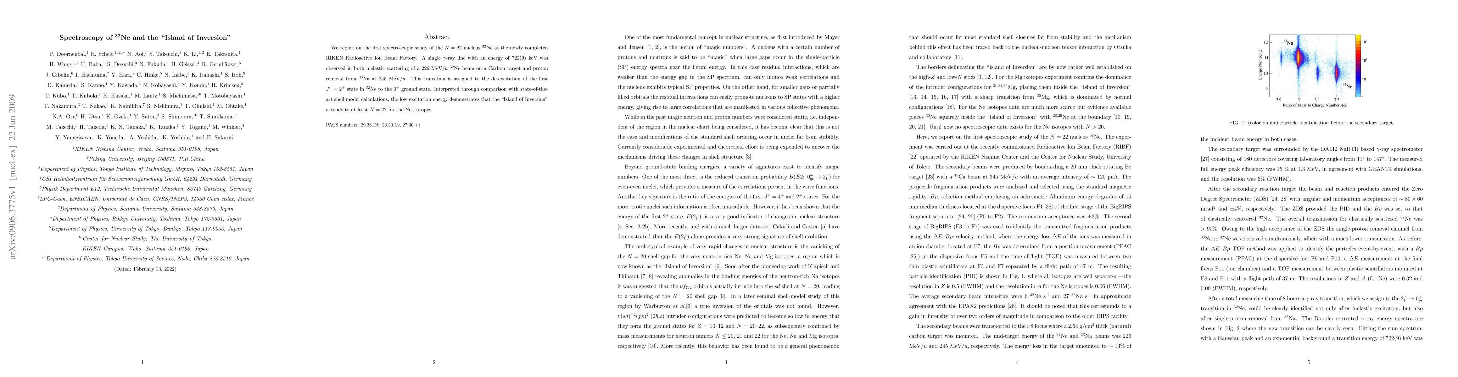 The research presents the first spectroscopic analysis of 32Ne, an N=22 nucleus, using RIKEN's new facility. A gamma-ray transition at 722(9) keV was identified, indicating the first J^pi = 2+ state's de-excitation to the 0+ ground state, confirming the Island of Inversion's extension to Ne isotopes with N up to 22.