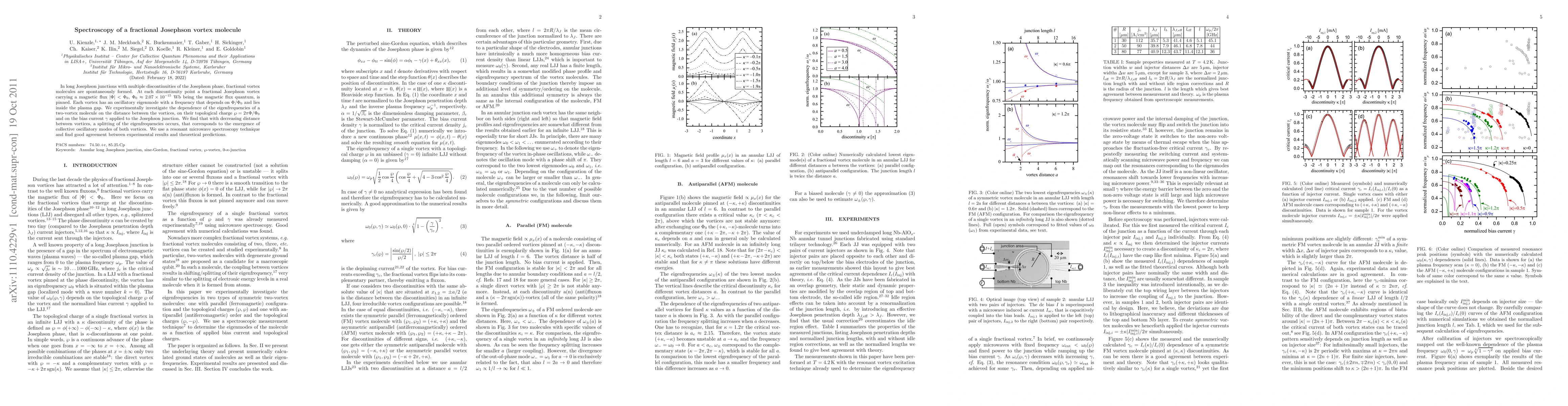 The paper presents an experimental investigation and agreement with theoretical predictions of the eigenfrequency dependence on vortex distance, topological charge, and bias current in fractional Josephson vortex molecules.