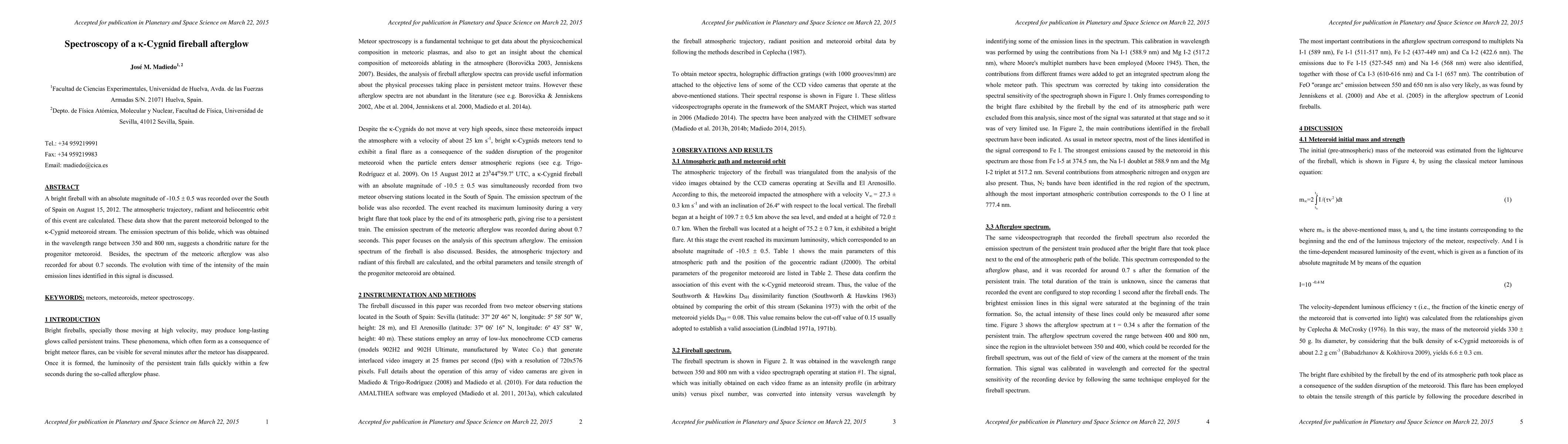 A 2012 fireball event from the ε-Cygnid meteoroid stream was analyzed for its emission spectrum and afterglow, revealing a chondritic nature and providing insights into the parent meteoroid's composition and atmospheric trajectory.