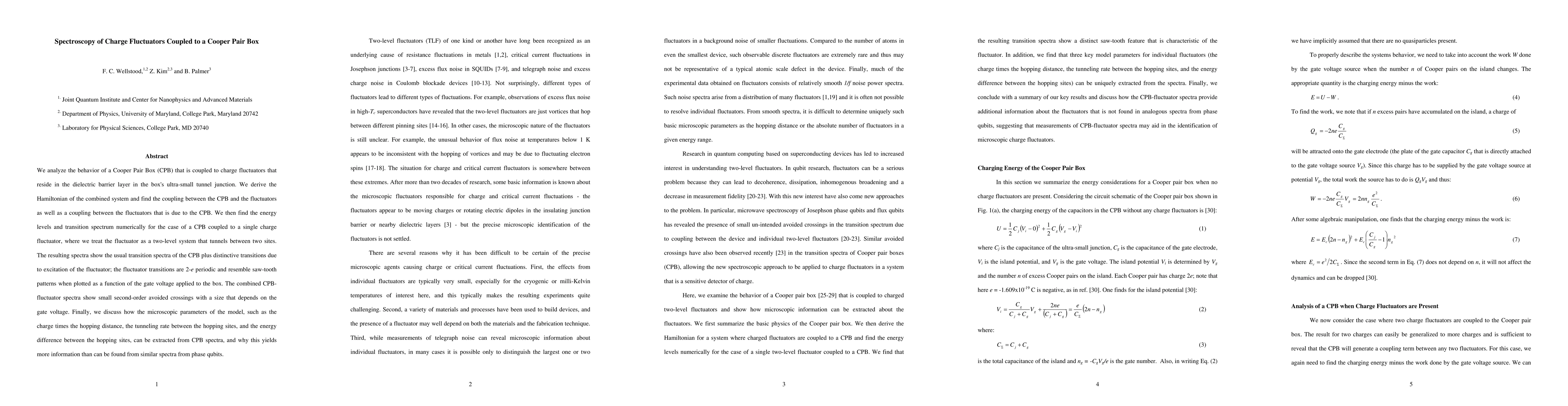 This paper investigates the spectroscopic behavior of a Cooper Pair Box (CPB) coupled to charge fluctuators in its dielectric barrier. It derives the Hamiltonian for the system and numerically analyzes the energy levels and transition spectra, revealing distinctive fluctuator-induced transitions and small second-order avoided crossings dependent on gate voltage.