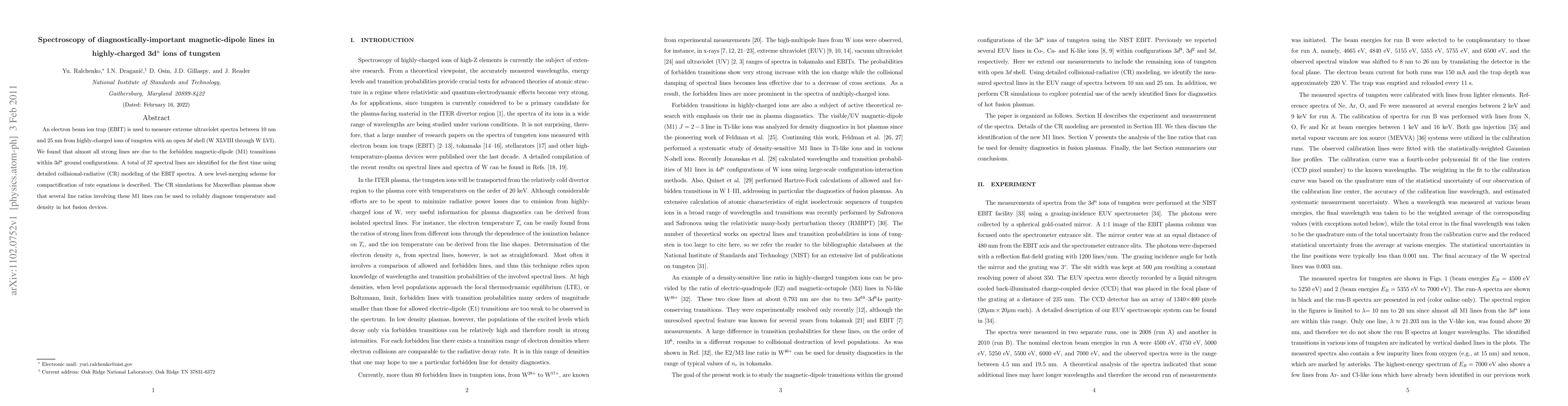 This paper reports on the spectroscopy of magnetic-dipole lines in highly-charged tungsten ions using an electron beam ion trap, identifying 37 new spectral lines from forbidden M1 transitions. The study introduces a new level-merging scheme and demonstrates that line ratios of these M1 transitions can diagnose temperature and density in fusion plasmas.
