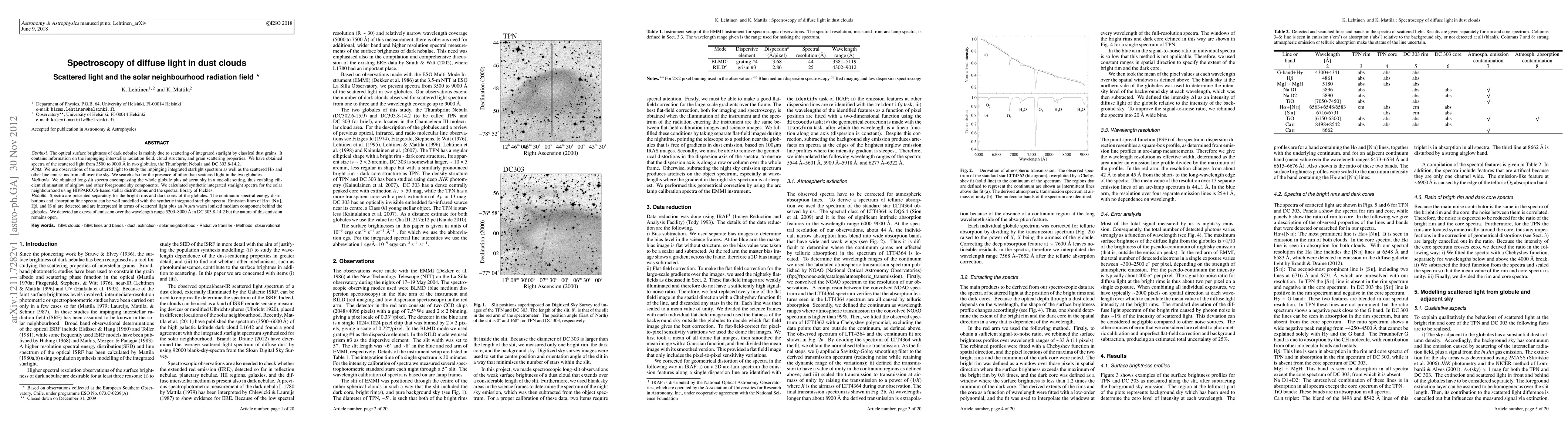 The optical surface brightness of dark nebulae is mainly due to scattering of integrated starlight by classical dust grains. It contains information on the impinging interstellar radiation field, cloud structure, and grain scattering properties. We have obtained spectra of the scattered light from 3500 to 9000 Angstrom in two globules, the Thumbprint Nebula and DC303.8-14.2. We use observations of the scattered light to study the impinging integrated starlight spectrum as well as the scattered H-alpha and other line emissions from all over the sky. We search also for the presence of other than scattered light in the two globules. We obtained long-slit spectra encompassing the whole globule plus adjacent sky in a one-slit setting, thus enabling efficient elimination of airglow and other foreground sky components. We calculated synthetic integrated starlight spectra for the solar neighbourhood using HIPPARCOS-based stellar distributions and the spectral library of Pickles. Spectra are presented separately for the bright rims and dark cores of the globules. The continuum spectral energy distributions and absorption line spectra can be well modelled with the synthetic integrated starlight spectra. Emission lines of H-alpha + NII, H-beta, and SII are detected and are interpreted in terms of scattered light plus an in situ warm ionized medium component behind the globules. We detected an excess of emission over the wavelength range 5200-8000 Angstrom in DC303.8-14.2 but the nature of this emission remains open.