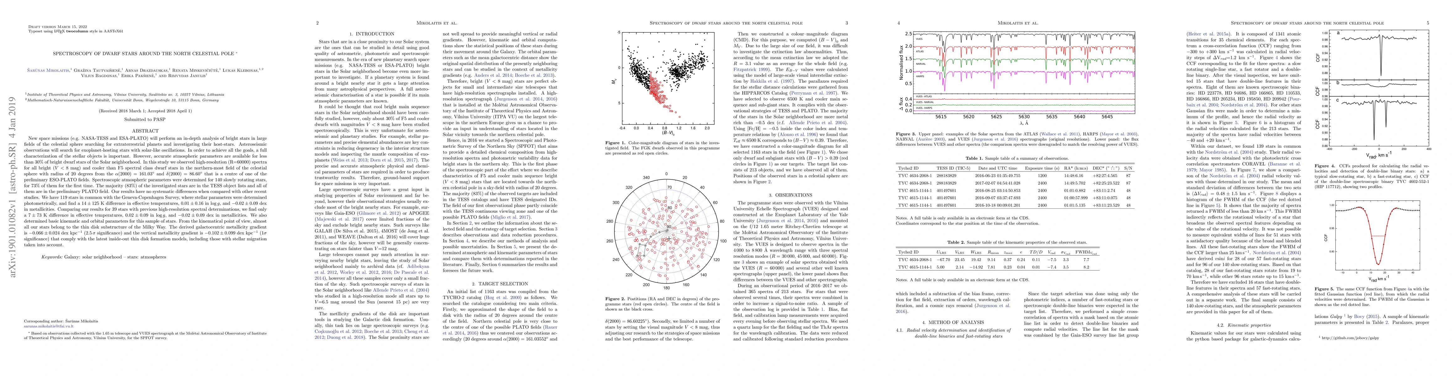 New space missions (e.g., NASA-TESS and ESA-PLATO) will perform an analysis of bright stars in large fields of the celestial sphere searching for extraterrestrial planets. Asteroseismic observations will search for exoplanet-hosting stars with solar-like oscillations. In order to achieve all the goals, a full characterization of the stellar objects is important. However, accurate atmospheric parameters are available for less than 30% of bright dwarf stars of the solar neighborhood. In this study we observed high-resolution (R = 60,000) spectra for all bright (V < 8 mag) and cooler than F5 spectral class dwarf stars in the northern-most field of the celestial sphere with radius of 20{\deg} from the {\alpha}(2000) = 161$^\circ$03 and {\delta}(2000) = 86$^\circ$60 that is a center of one of the preliminary ESO-PLATO fields. Spectroscopic atmospheric parameters were determined for 140 slowly rotating stars, for 73% of them for the first time. The majority (83%) of the investigated stars are in the TESS object lists and all of them are in the preliminary PLATO field. Our results have no systematic differences when compared with other recent studies. Comparing our results for 39 stars with previous high-resolution spectral determinations, we find only a 7 $\pm$ 73 K difference in effective temperatures, 0.02 $\pm$ 0.09 in log g, and -0.02 $\pm$ 0.09 dex in metallicities. We also determined basic kinematic and orbital parameters for this sample of stars. From the kinematical point of view, almost all our stars belong to the thin disk substructure of the Milky Way. The derived galactocentric metallicity gradient is -0.066 $\pm$ 0.024 dex/kpc (2.5{\sigma} significance) and the vertical metallicity gradient is -0.102 $\pm$ 0.099 dex/kpc (1{\sigma} significance) that comply with the latest inside-out thin disk formation models, including those with stellar migration taken into account.