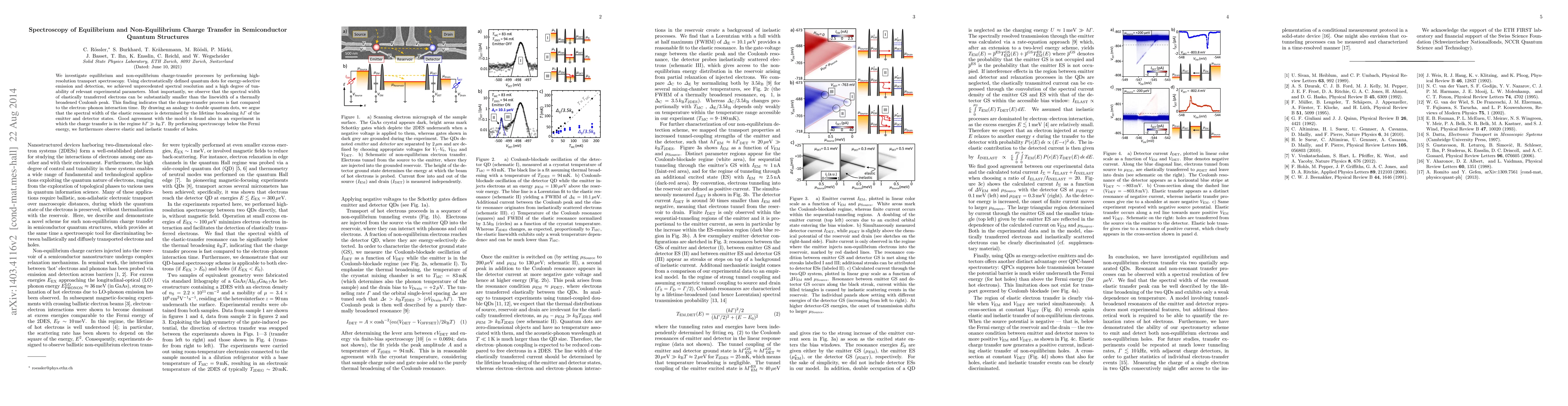 We investigate equilibrium and non-equilibrium charge-transfer processes by performing high-resolution transport spectroscopy. Using electrostatically defined quantum dots for energy-selective emission and detection, we achieved unprecedented spectral resolution and a high degree of tunability of relevant experimental parameters. Most importantly, we observe that the spectral width of elastically transferred electrons can be substantially smaller than the linewidth of a thermally broadened Coulomb peak. This finding indicates that the charge-transfer process is fast compared to the electron--phonon interaction time. By drawing an analogy to double quantum dots, we argue that the spectral width of the elastic resonance is determined by the lifetime broadening $h\it{\Gamma}$ of the emitter and detector states. Good agreement with the model is found also in an experiment in which the charge transfer is in the regime $h\it{\Gamma}\gg k_{\rm{B}}T$. By performing spectroscopy below the Fermi energy, we furthermore observe elastic and inelastic transfer of holes.