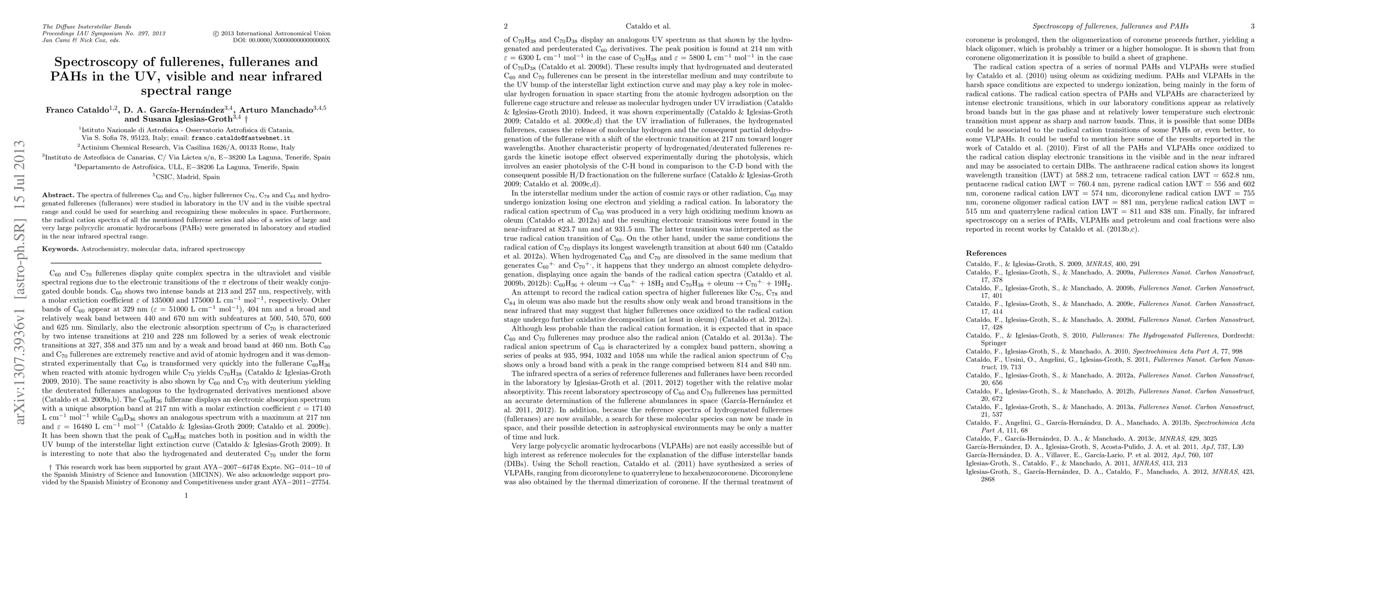 This study investigates the UV, visible, and near-infrared spectra of fullerenes, fulleranes, and polycyclic aromatic hydrocarbons (PAHs), providing valuable data for identifying these molecules in space. Laboratory-generated spectra of fullerene radical cations and PAHs enhance our understanding of their spectral characteristics.