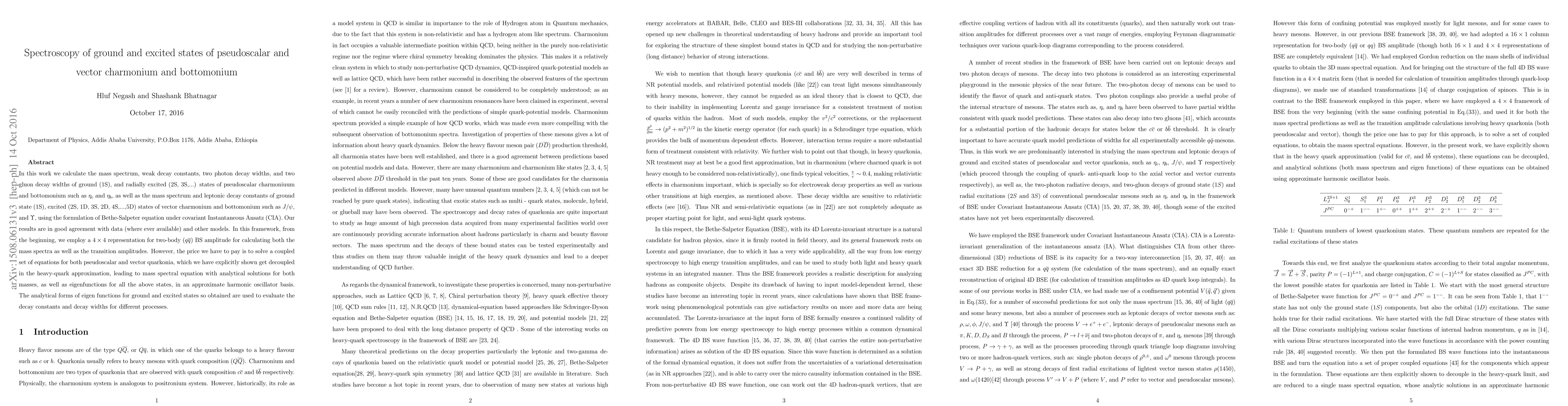 In this work we calculate the mass spectrum, weak decay constants, two photon decay widths, and two gluon decay widths of ground (1S), and radially excited (2S,3S,...) states of pseudoscalar charmoniuum and bottomonium such as $\eta_{c}$ and $\eta_{b}$, as well as the mass spectrum and leptonic decay constants of ground state (1S), excited (2S,1D,3S,2D,4S,and 3D) states of vector charmonium and bottomonium such as $J/\psi$, and $\Upsilon$, using the formulation of Bethe-Salpeter equation under covariant Instantaneous Ansatz (CIA). Our results are in good agreement with data (where ever available) and other models. In this framework, from the beginning, we employ a $4\times 4$ representation for two-body ($q\overline{q}$) BS amplitude for calculating both the mass spectra as well as the transition amplitudes. However, the price we have to pay is to solve a coupled set of equations for both pseudoscalar and vector quarkonia, which we have explicitly shown get decoupled in the heavy-quark approximation, leading to mass spectral equation with analytical solutions for both masses, as well as eigenfunctions for all the above states, in an approximate harmonic oscillator basis. Further, in the present framework of BSE, the hadron-quark vertex function (and the full 4D BS wave function) for pseudoscalar and vector quarkonia used for calculation of various processes, accommodates all the Dirac structures from their complete set in a natural manner.