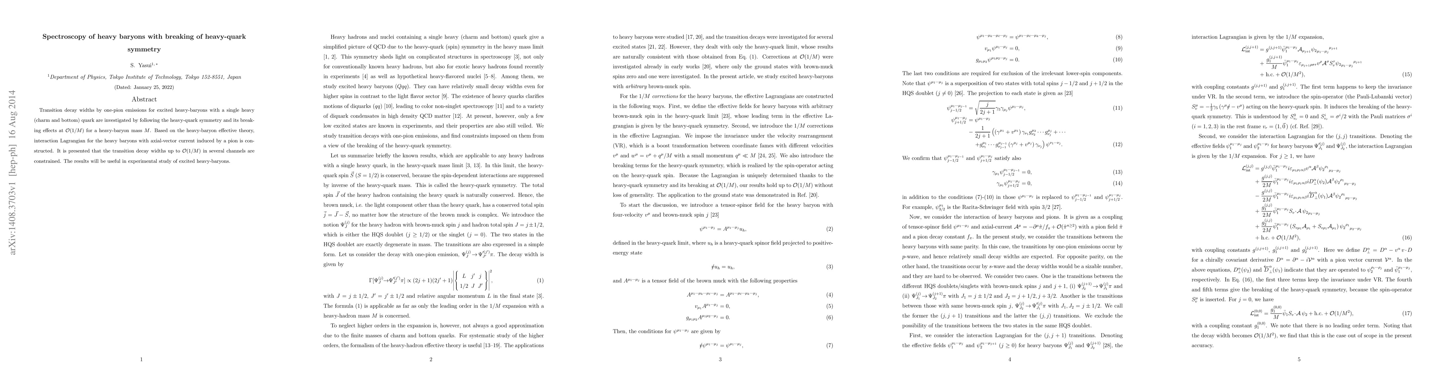 Transition decay widths by one-pion emissions for excited heavy-baryons with a single heavy (charm and bottom) quark are investigated by following the heavy-quark symmetry and its breaking effects at ${\cal O}(1/M)$ for a heavy-baryon mass $M$. Based on the heavy-baryon effective theory, interaction Lagrangian for the heavy baryons with axial-vector current induced by a pion is constructed. It is presented that the transition decay widths up to ${\cal O}(1/M)$ in several channels are constrained. The results will be useful in experimental study of excited heavy-baryons.