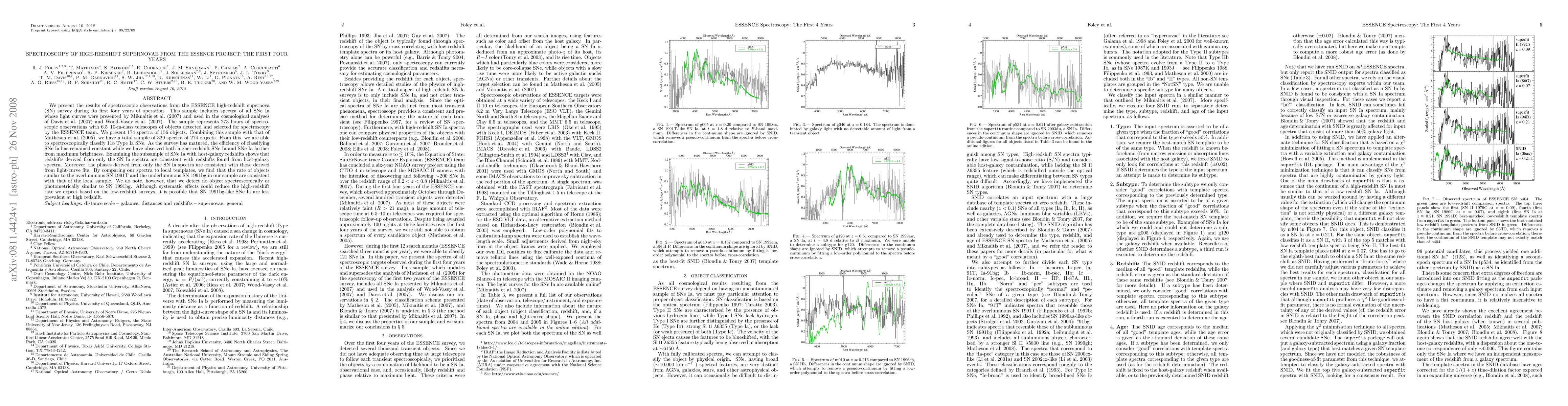 We present the results of spectroscopic observations from the ESSENCE high-redshift supernova (SN) survey during its first four years of operation. This sample includes spectra of all SNe Ia whose light curves were presented by Miknaitis et al. (2007) and used in the cosmological analyses of Davis et al. (2007) and Wood-Vasey et al. (2007). The sample represents 273 hours of spectroscopic observations with 6.5 - 10-m-class telescopes of objects detected and selected for spectroscopy by the ESSENCE team. We present 174 spectra of 156 objects. Combining this sample with that of Matheson et al. (2005), we have a total sample of 329 spectra of 274 objects. From this, we are able to spectroscopically classify 118 Type Ia SNe. As the survey has matured, the efficiency of classifying SNe Ia has remained constant while we have observed both higher-redshift SNe Ia and SNe Ia farther from maximum brightness. Examining the subsample of SNe Ia with host-galaxy redshifts shows that redshifts derived from only the SN Ia spectra are consistent with redshifts found from host-galaxy spectra. Moreover, the phases derived from only the SN Ia spectra are consistent with those derived from light-curve fits. By comparing our spectra to local templates, we find that the rate of objects similar to the overluminous SN 1991T and the underluminous SN 1991bg in our sample are consistent with that of the local sample. We do note, however, that we detect no object spectroscopically or photometrically similar to SN 1991bg. Although systematic effects could reduce the high-redshift rate we expect based on the low-redshift surveys, it is possible that SN 1991bg-like SNe Ia are less prevalent at high redshift.