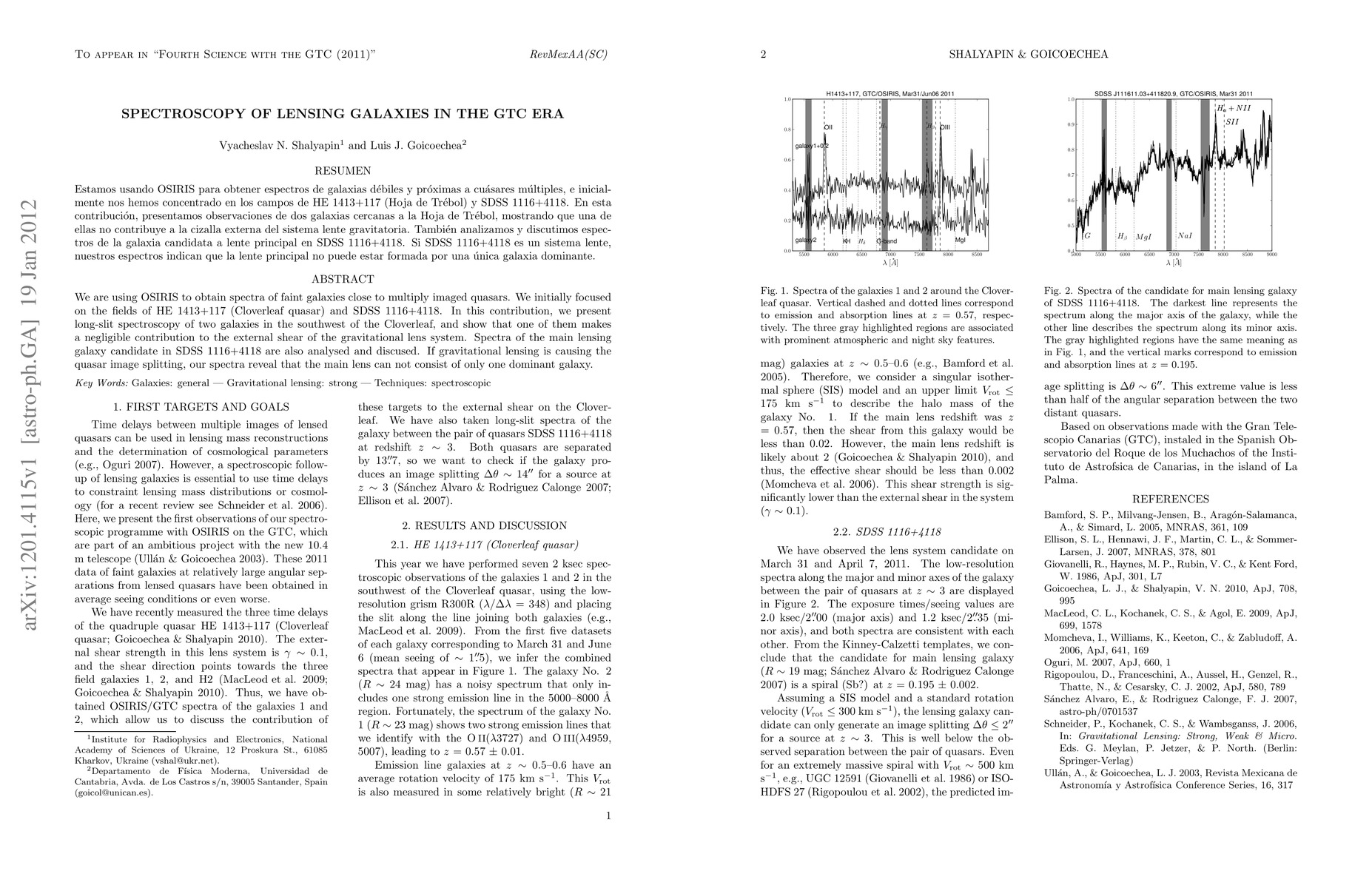 This paper uses OSIRIS on the GTC to analyze spectra of lensing galaxies near multiply imaged quasars, focusing on HE 1413+117 and SDSS 1116+4118. It finds that one galaxy in the Cloverleaf quasar system has a negligible effect on the external shear, while spectra suggest the main lensing galaxy in SDSS 1116+4118 cannot be dominated by a single galaxy.