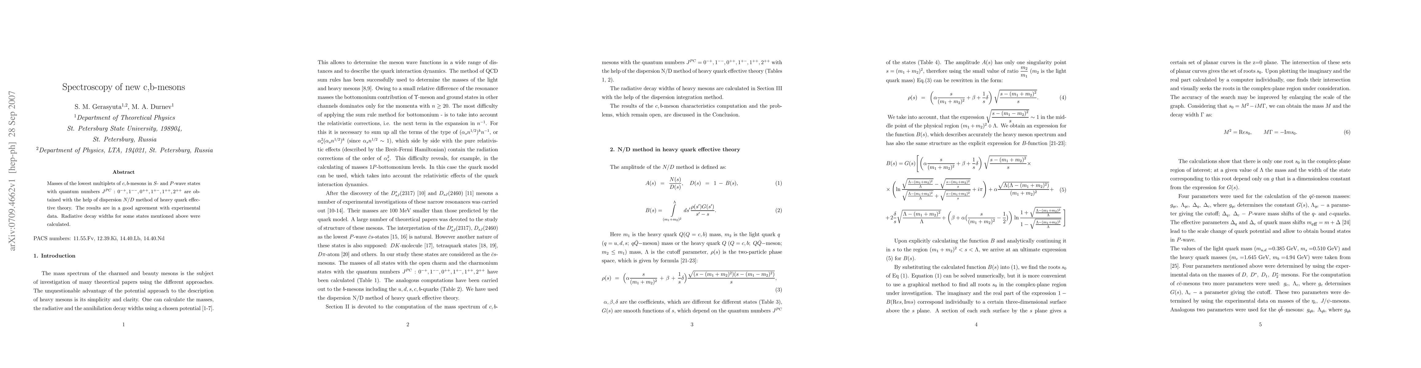 Masses of the lowest multiplets of c,b-mesons in S- and P-wave states with quantum numbers JPC: 0-+, 1--, 0++, 1+-, 1++, 2++ are obtained with the help of dispersion N/D method of heavy quark effective theory. The results are in a good agreement with experimental data. Radiative decay widths for some states mentioned above were calculated.