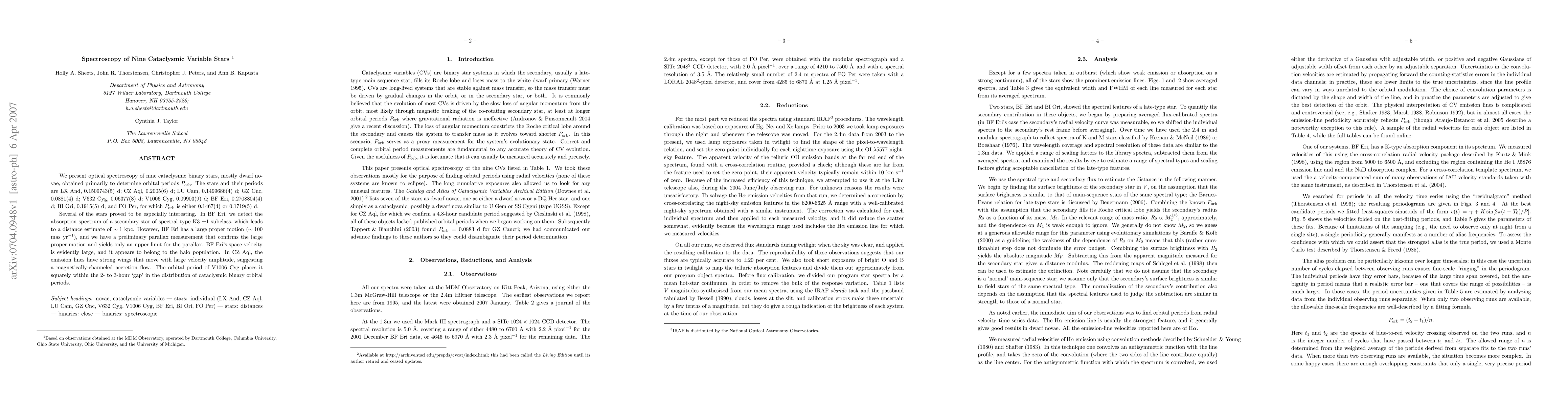 This paper presents optical spectroscopy of nine cataclysmic variable stars, primarily dwarf novae, to determine their orbital periods. Notable findings include BF Eri's large proper motion and potential halo population membership, and V1006 Cyg's placement in the "gap" of cataclysmic binary orbital periods.
