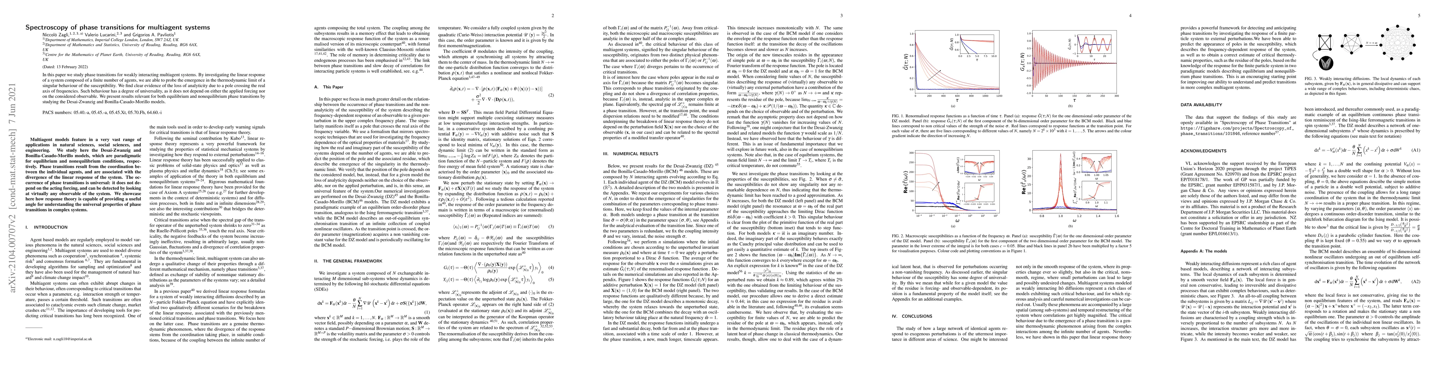In this paper we study phase transitions for weakly interacting multiagent systems. By investigating the linear response of a system composed of a finite number of agents, we are able to probe the emergence in the thermodynamic limit of a singular behaviour of the susceptibility. We find clear evidence of the loss of analyticity due to a pole crossing the real axis of frequencies. Such behaviour has a degree of universality, as it does not depend on either the applied forcing nor on the considered observable. We present results relevant for both equilibrium and nonequilibrium phase transitions by studying the Desai-Zwanzig and Bonilla-Casado-Morillo models.