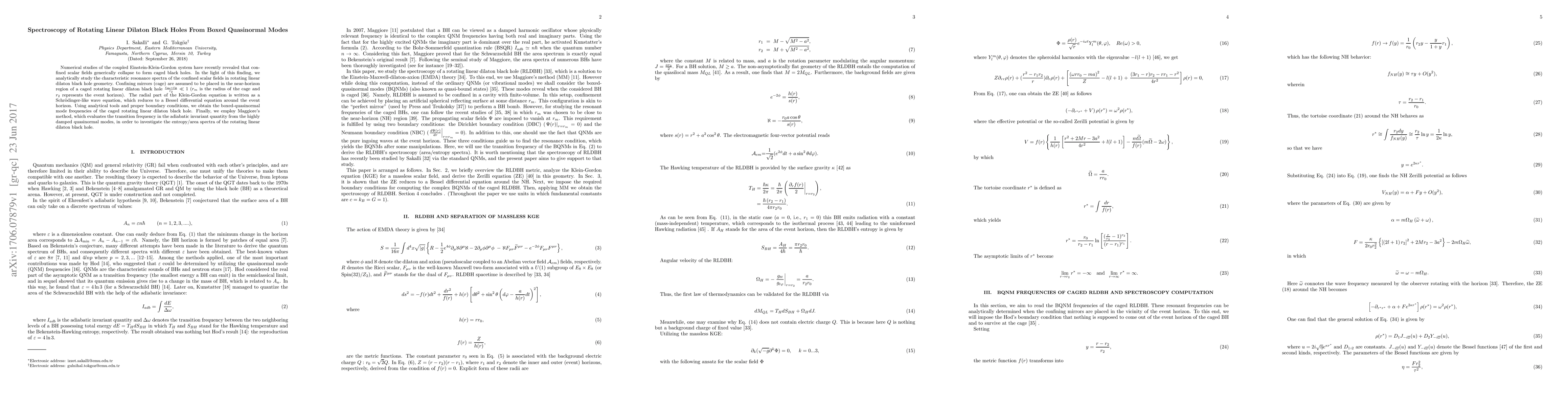 This paper analytically studies the resonance spectra of confined scalar fields in rotating linear dilaton black holes using boxed quasinormal modes. It employs analytical tools to derive frequencies of these modes and employs Maggiore's method to investigate the entropy/area spectra of such black holes.