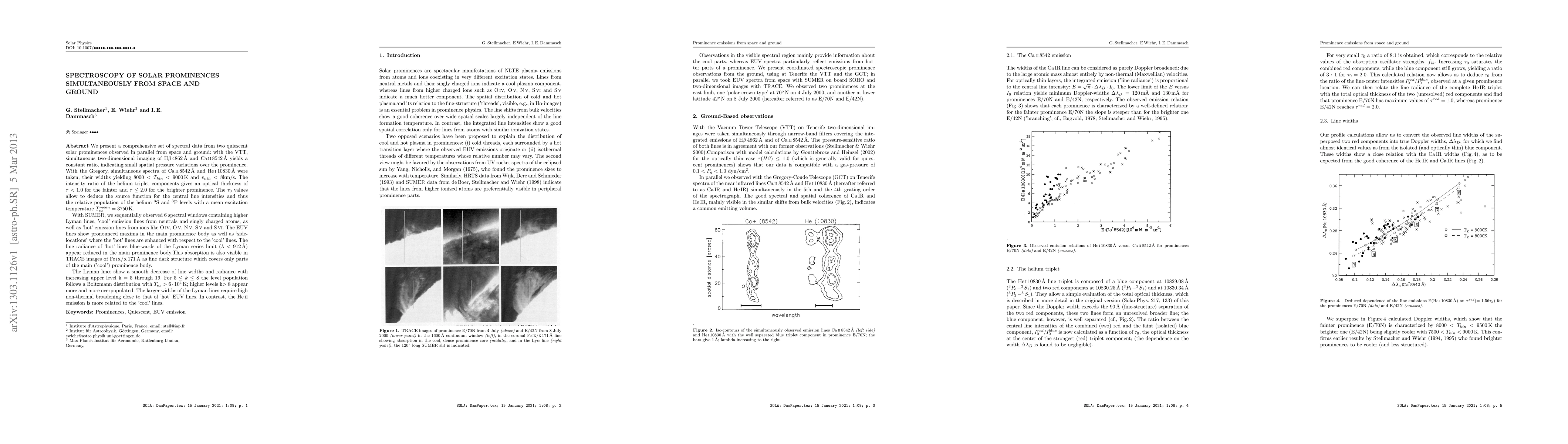 We present a comprehensive set of spectral data from two quiescent solar prominences observed in parallel from space and ground: with the VTT, simultaneous two-dimensional imaging of H-beta 4862 and Ca II 8542 yields a constant ratio, indicating small spatial pressure variations over the prominences. With the Gregory, simultaneous spectra of Ca II 8542 and He I 10830 were taken, their widths yielding 8000< T_kin< 9000 K and v_nth<8 km/s. The intensity ratio of the helium triplet components gives an optical thickness of tau < 1.0 for the fainter and tau < 2.0 for the brighter prominence. The tau_0 values allow to deduce the source function for the central line intensities and thus the relative population of the helium 3S and 3P levels with a mean excitation temperature T_ex = 3750 K. With SUMER, we sequentially observed 6 spectral windows containing higher Lyman lines, 'cool' emission lines from neutrals and singly charged atoms, as well as 'hot' emission lines from ions like O IV, O V, N V, S V and S VI. The EUV lines show pronounced maxima in the main prominence body as well as 'side-locations' where the 'hot' lines are enhanced with respect to the 'cool' lines. The line radiance of 'hot' lines blue-wards of the Lyman series limit (lambda<912 A) appear reduced in the main prominence body. This absorption is also visible in TRACE images of Fe IX/X 171 as fine dark structure which covers only parts of the main ('cool') prominence body. The Lyman lines show a smooth decrease of line widths and radiance with increasing upper level k = 5 through 19. For k= 5 through 8 the level population follows a Boltzmann distribution with T_ex >6 *10^4 K; higher levels k > 8 appear more and more overpopulated. The larger widths of the Lyman lines require high non-thermal broadening close to that of 'hot' EUV lines. In contrast, the He II emission is more related to the 'cool' lines.