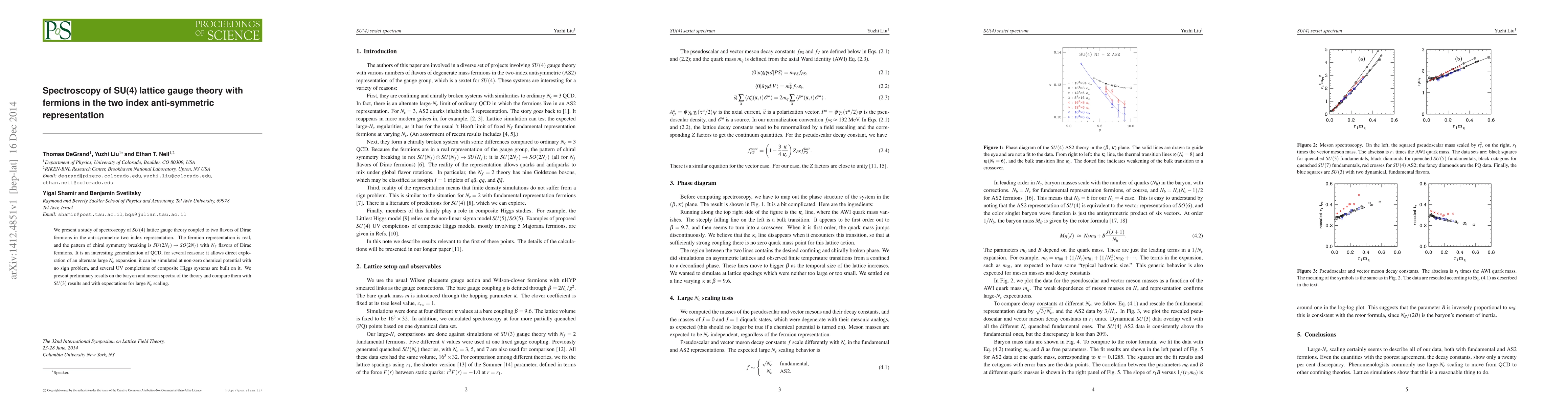 This paper investigates the spectroscopy of SU(4) lattice gauge theory with two flavors of Dirac fermions in the anti-symmetric representation, revealing a chiral symmetry breaking pattern and presenting preliminary results on baryon and meson spectra, comparing them with SU(3) results and large Nc scaling expectations. The study offers insights into alternate large Nc expansions and potential composite Higgs systems.