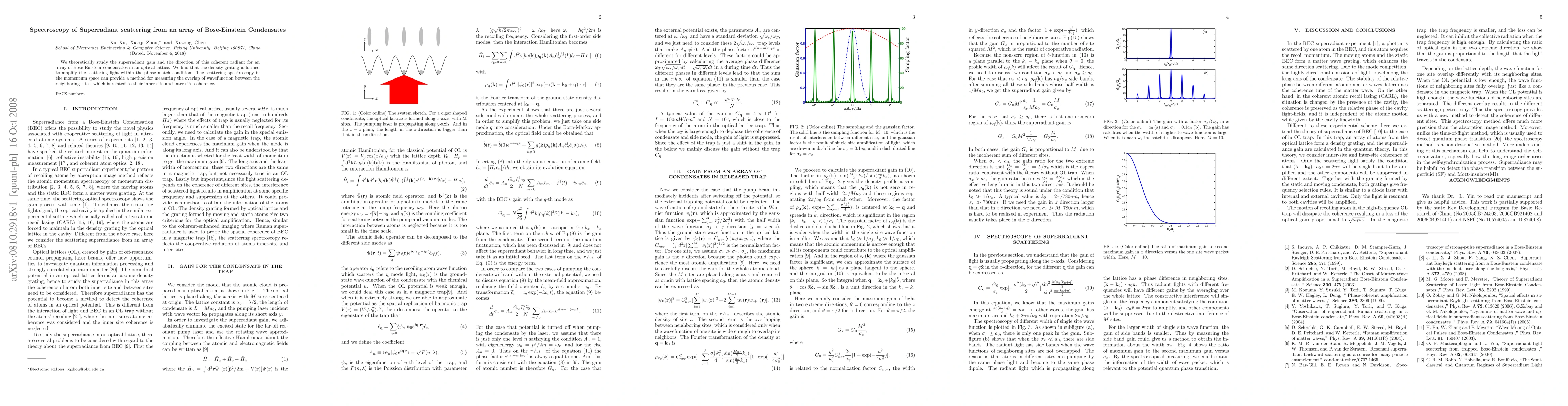 We theoretically study the superradiant gain and the direction of this coherent radiant for an array of Bose-Einstein condensates in an optical lattice. We find that the density grating is formed to amplify the scattering light within the phase match condition. The scattering spectroscopy in the momentum space can provide a method for measuring the overlap of wavefunction between the neighboring sites, which is related to their inner-site and inter-site coherence.