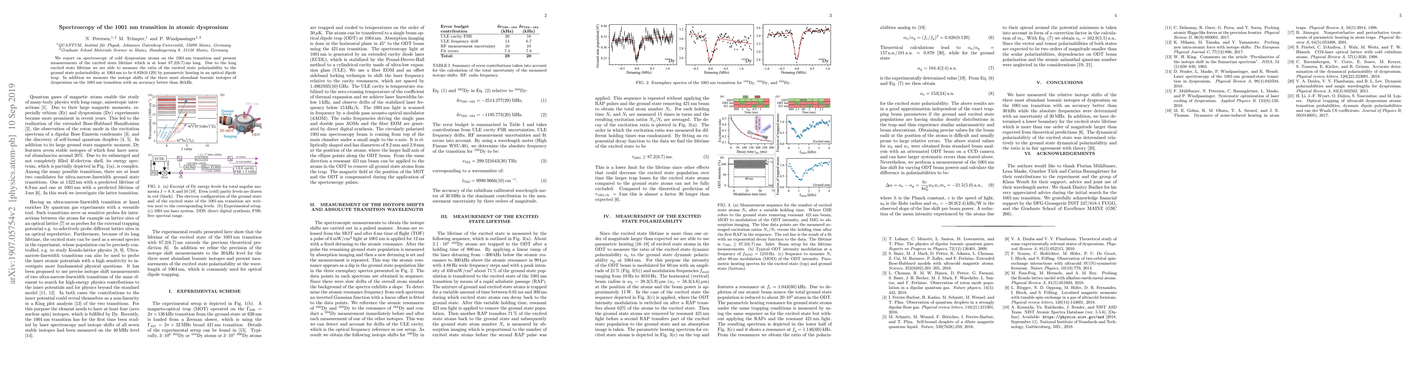 We report on spectroscopy of cold dysprosium atoms on the $1001\,\mathrm{nm}$ transition and present measurements of the excited state lifetime which is at least $87.2(6.7)\,\mathrm{ms}$ long. Due to the long excited state lifetime we are able to measure the ratio of the excited state polarizability to the ground state polarizability at $1064\,\mathrm{nm}$ to be $0.828(0.129)$ by parametric heating in an optical dipole trap. In addition we measure the isotope shifts of the three most abundant bosonic isotopes of dysprosium on the $1001\,\mathrm{nm}$ transition with an accuracy better than $30\,\mathrm{kHz}$.