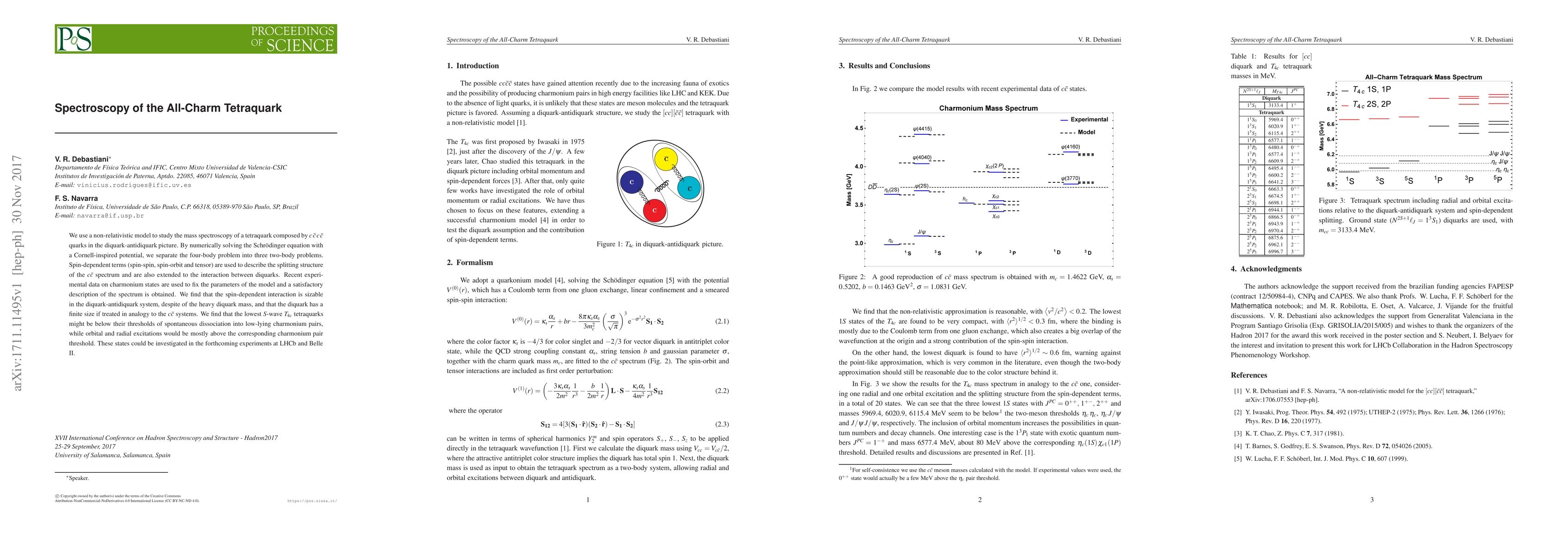 We use a non-relativistic model to study the mass spectroscopy of a tetraquark composed by $c \, \bar{c} \, c \, \bar{c}$ quarks in the diquark-antidiquark picture. By numerically solving the Schr\"{o}dinger equation with a Cornell-inspired potential, we separate the four-body problem into three two-body problems. Spin-dependent terms (spin-spin, spin-orbit and tensor) are used to describe the splitting structure of the $c\bar{c}$ spectrum and are also extended to the interaction between diquarks. Recent experimental data on charmonium states are used to fix the parameters of the model and a satisfactory description of the spectrum is obtained. We find that the spin-dependent interaction is sizable in the diquark-antidiquark system, despite of the heavy diquark mass, and that the diquark has a finite size if treated in analogy to the $c\bar{c}$ systems. We find that the lowest $S$-wave $T_{4c}$ tetraquarks might be below their thresholds of spontaneous dissociation into low-lying charmonium pairs, while orbital and radial excitations would be mostly above the corresponding charmonium pair threshold. These states could be investigated in the forthcoming experiments at LHCb and Belle II.