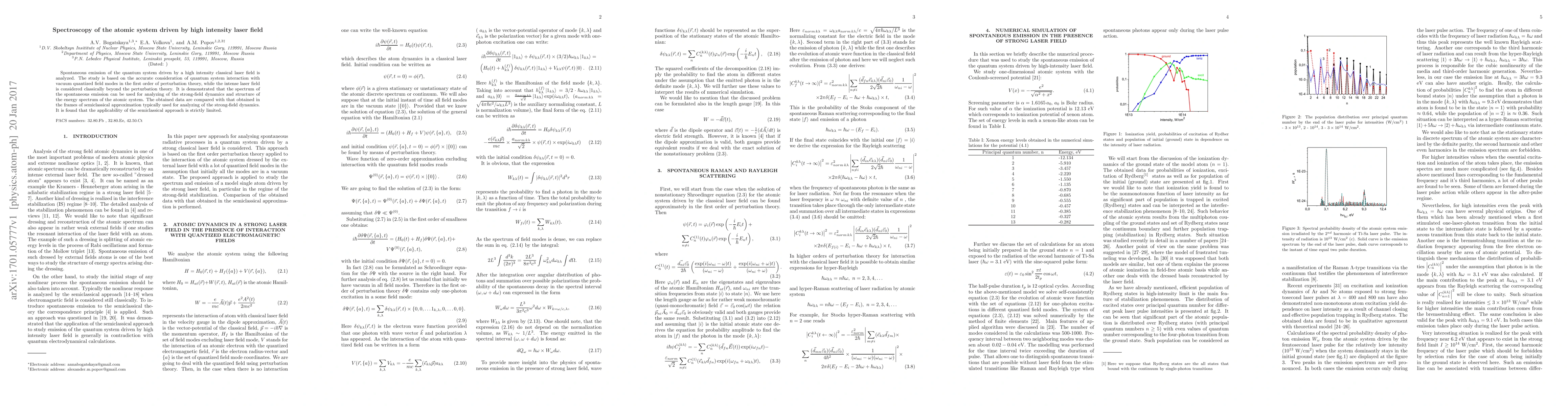This paper analyzes the spontaneous emission of an atomic system driven by a high-intensity laser field, considering quantum interactions with the vacuum field. It finds that the spectrum of spontaneous emission provides insights into the atomic system's dynamics and energy structure, revealing limitations in the applicability of the semiclassical approach.