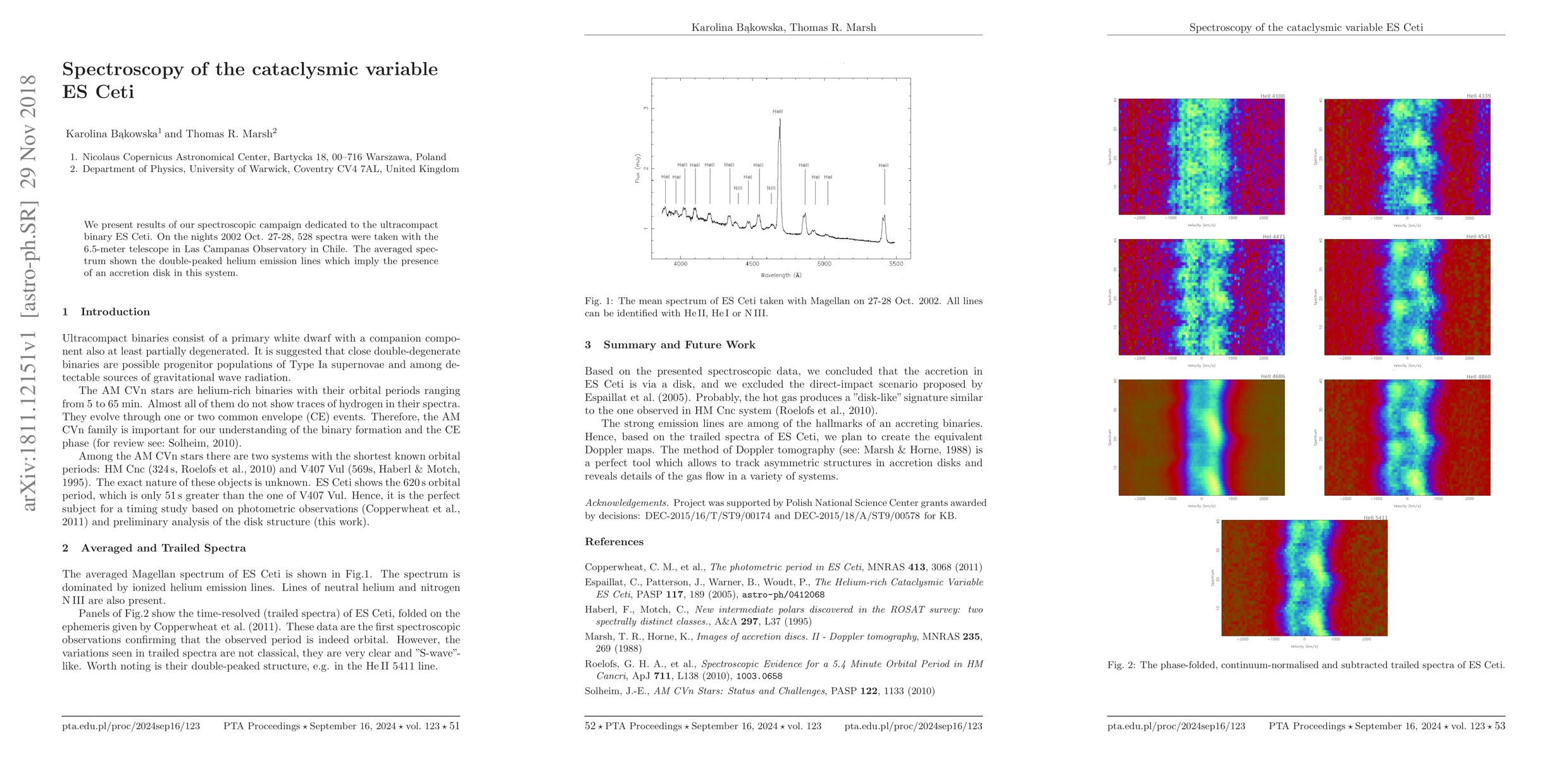 We present results of our spectroscopic campaign dedicated to the ultracompact binary ES Ceti. On the nights 2002 Oct. 27-28, 528 spectra were taken with the 6.5-meter telescope in Las Campanas Observatory in Chile. The averaged spectrum shown the double-peaked helium emission lines which imply the presence of an accretion disk in this system.
