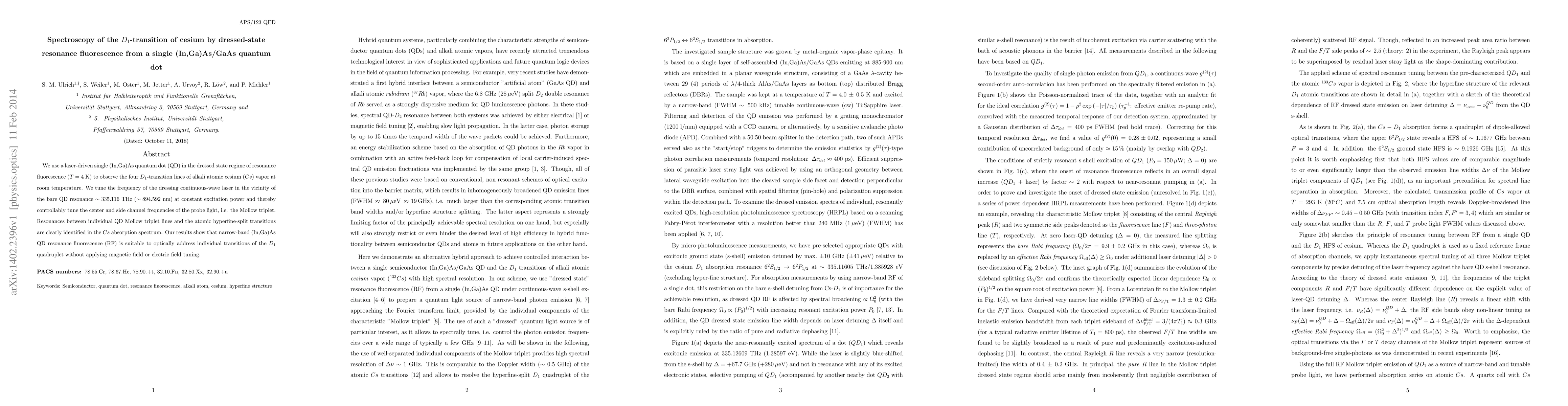 A single quantum dot is used to measure the D1-transition of cesium with high precision using a technique called dressed-state resonance fluorescence. This method allows for narrow-band measurement without applying magnetic or electric fields.