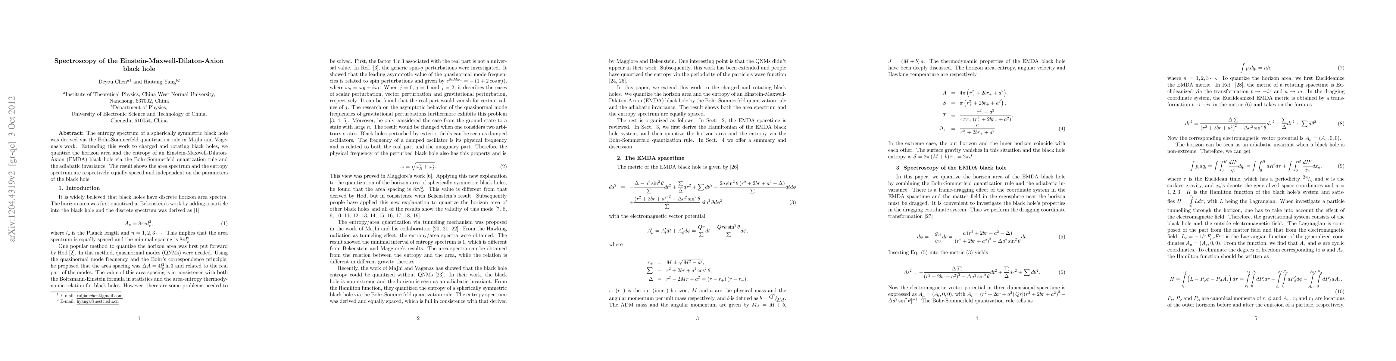 This paper quantizes the horizon area and entropy of Einstein-Maxwell-Dilaton-Axion (EMDA) black holes using the Bohr-Sommerfeld rule and adiabatic invariance, revealing equally spaced area and entropy spectra independent of black hole parameters. The study extends the entropy spectrum derivation to charged and rotating black holes.