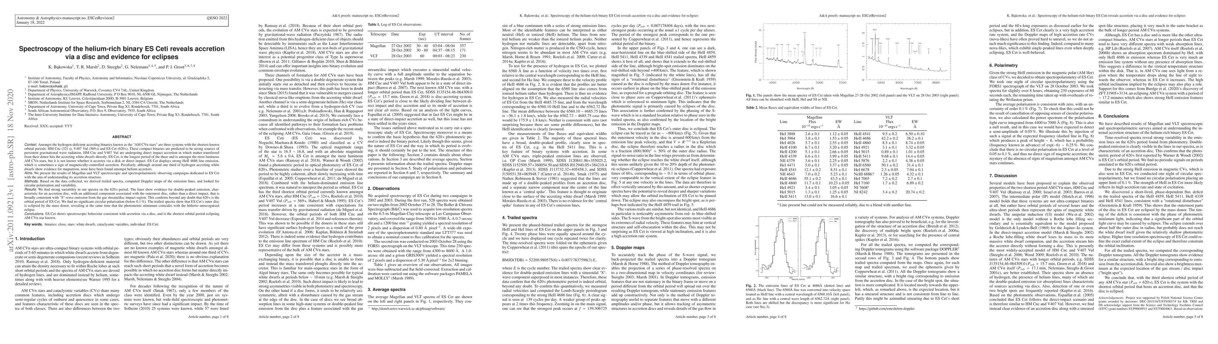 Amongst the hydrogen-deficient accreting binaries known as the "AM~CVn stars" are three systems with the shortest known orbital periods: HM Cnc (321 s), V407 Vul (569 s) and ES Cet (620 s). These compact binaries are predicted to be strong sources of persistent gravitational wave radiation. HM Cnc and V407 Vul are undergoing direct impact accretion in which matter transferred from their donor hits the accreting white dwarfs directly. ES Cet, is the longest period of the three and is amongst the most luminous AM CVn stars, but it is not known whether it accretes via a disk or direct impact. ES Cet displays strong HeII 4686 line emission, which is sometimes a sign of magnetically-controlled accretion. Peculiarly, although around one third of hydrogen accreting white dwarfs show evidence for magnetism, none have been found amongst helium accretors. We present the results of Magellan and VLT spectroscopic and spectropolarimetric observing campaigns dedicated to ES Cet with the aim of understanding its accretion structure. We find strong variability in our spectra on the 620 s period. The lines show evidence for double-peaked emission, characteristic for an accretion disc, with an additional component associated with the outermost disc, rather than a direct impact, that is broadly consistent with "S"-wave emission from the gas stream/disc impact region. This confirms beyond any doubt that 620\,s is the orbital period of ES Cet. We find no significant circular polarisation (below 0.1 %). The trailed spectra show that ES Cet's outer disc is eclipsed by the mass donor, revealing at the same time that the photometric minimum coincides with the hitherto unrecognised eclipse. ES Cet shows spectroscopic behaviour consistent with accretion via a disc, and is the shortest orbital period eclipsing AM CVn star known.