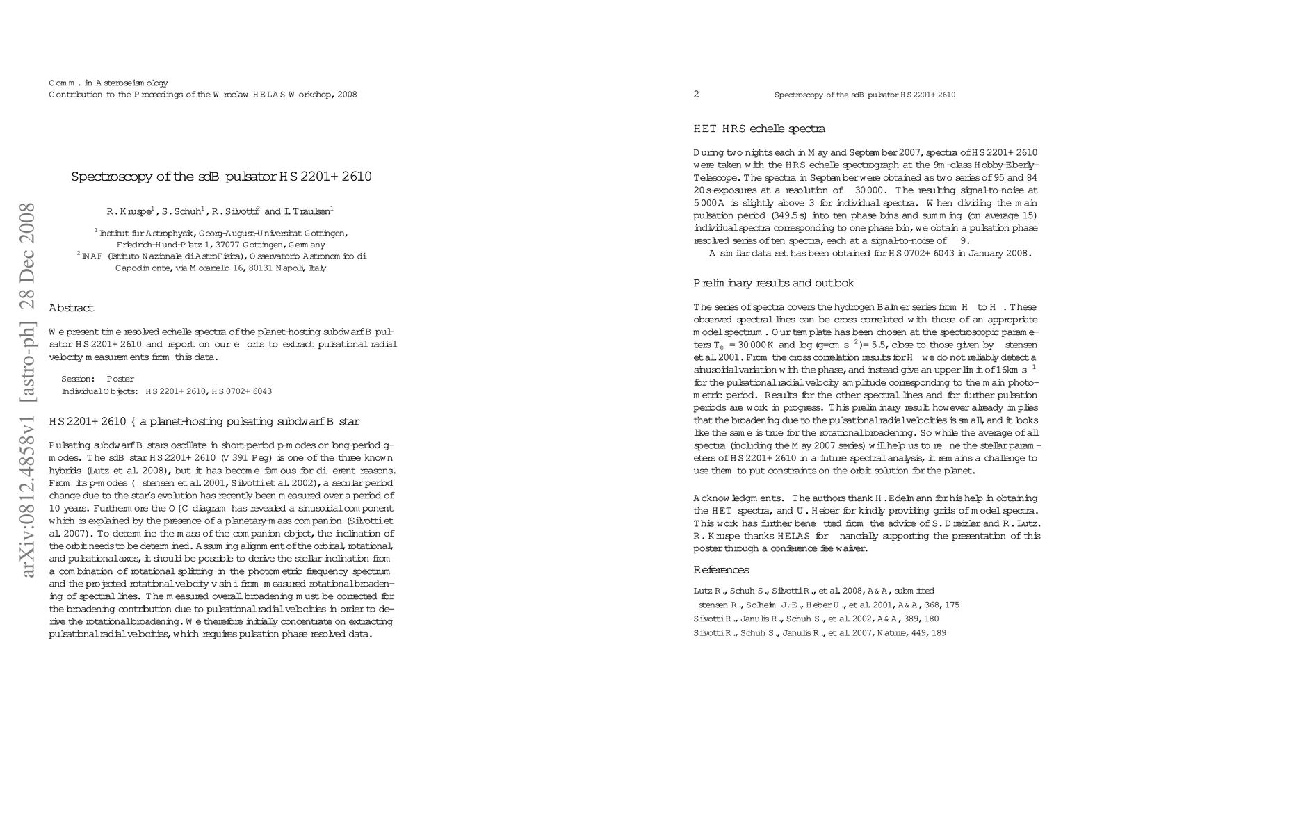 Summary: This study presents time-resolved echelle spectra of the sdB pulsator HS 2201 + 2610, focusing on extracting pulsational radial velocity measurements to better understand its pulsation characteristics. The research highlights the star's status as a planet-hosting subdwarf B pulsator.