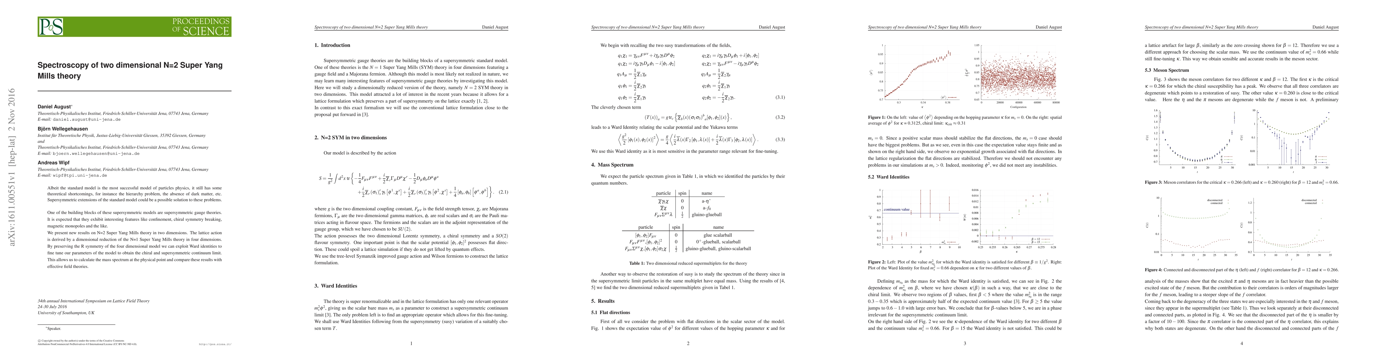 Albeit the standard model is the most successful model of particles physics, it still has some theoretical shortcomings, for instance the hierarchy problem, the absence of dark matter, etc. Supersymmetric extensions of the standard model could be a possible solution to these problems. One of the building blocks of these supersymmetric models are supersymmetric gauge theories. It is expected that they exhibit interesting features like confinement, chiral symmetry breaking, magnetic monopoles and the like. We present new results on N=2 Super Yang Mills theory in two dimensions. The lattice action is derived by a dimensional reduction of the N=1 Super Yang Mills theory in four dimensions. By preserving the R symmetry of the four dimensional model we can exploit Ward identities to fine tune our parameters of the model to obtain the chiral and supersymmetric continuum limit. This allows us to calculate the mass spectrum at the physical point and compare these results with effective field theories.