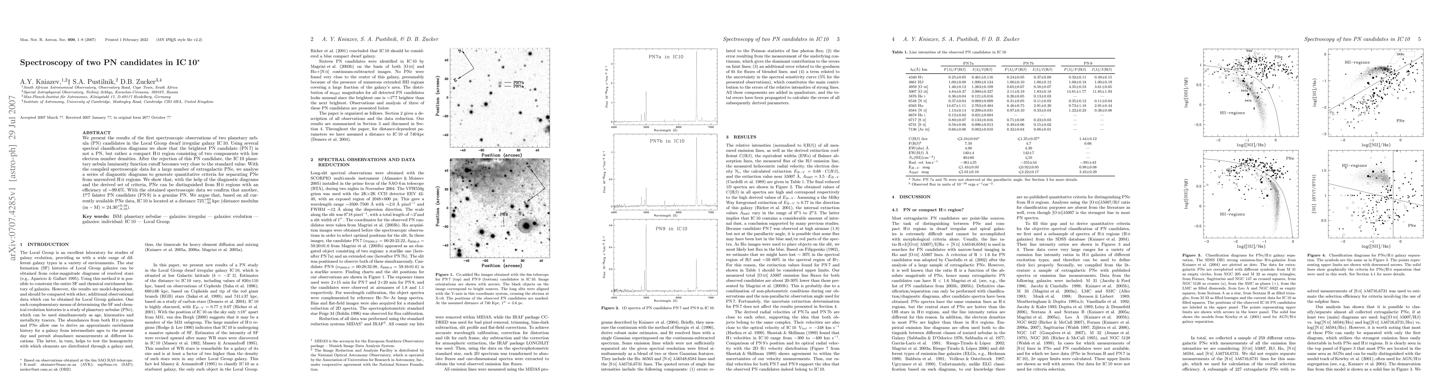The research presents the first spectroscopic observations of two planetary nebula (PN) candidates in the Local Group dwarf irregular galaxy IC10, using spectral classification diagrams to distinguish PNe from HII regions.