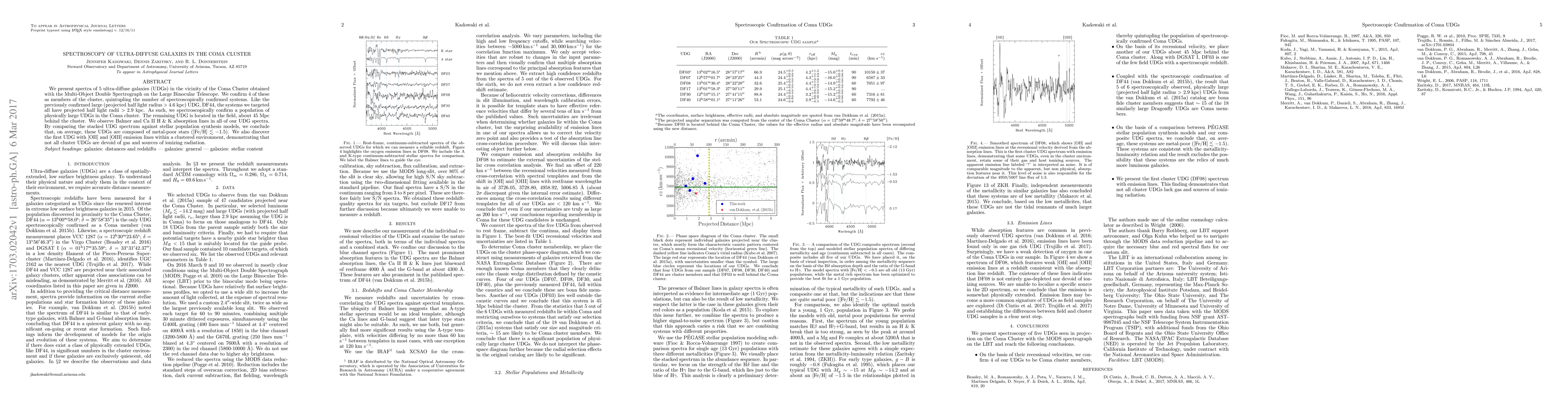 This paper presents spectra of 5 ultra-diffuse galaxies (UDGs) in the Coma Cluster, confirming 4 as cluster members and identifying them as physically large systems with projected half light radii greater than 2.9 kpc. The study reveals metal-poor stellar populations and finds the first UDG in a cluster with gas and ionizing radiation.