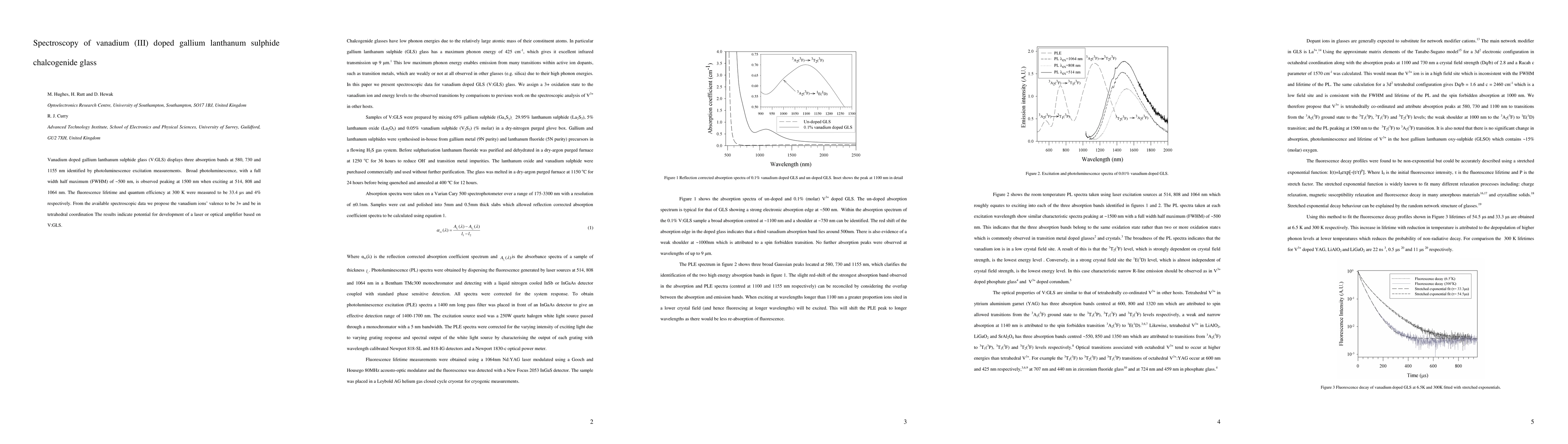 This study investigates vanadium (III) doped gallium lanthanum sulphide glass (V:GLS), revealing three absorption bands and broad photoluminescence peaking at 1500 nm, suggesting potential for laser or optical amplifier applications. The fluorescence lifetime and quantum efficiency were measured at 33.4 us and 4% respectively.