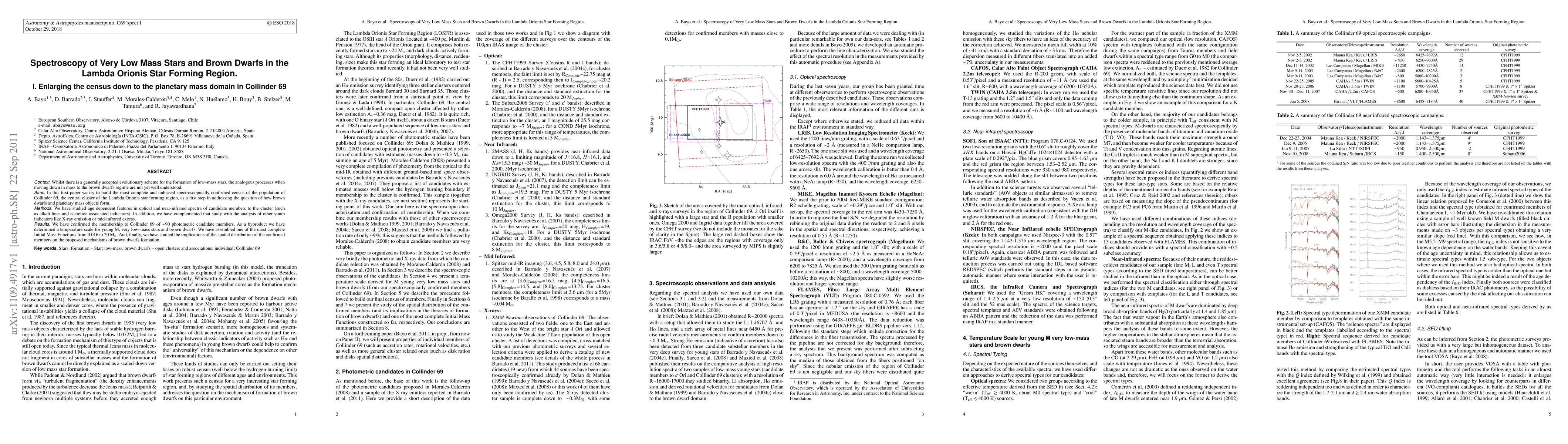 Whilst there is a generally accepted evolutionary scheme for the formation of low-mass stars, the analogous processes when moving down in mass to the brown dwarfs regime are not yet well understood. In this first paper we try to build the most complete and unbiased spectroscopically confirmed census of the population of Collinder 69, the central cluster of the Lambda Orionis star forming region, as a first step in addressing the question of how brown dwarfs and planetary mass objects form. We have studied age dependent features in optical and near-infrared spectra of candidate members to the cluster (such as alkali lines and accretion associated indicators). In addition, we have complemented that study with the analysis of other youth indicators like X-ray emission or mid-infrared excess. We have confirmed the membership to Collinder 69 of \sim90 photometric candidate members. As a byproduct we have determined a temperature scale for young M, very low-mass stars and brown dwarfs. We have assembled one of the most complete Initial Mass Functions from 0.016 to 20 M\odot. And, finally, we have studied the implications of the spatial distribution of the confirmed members on the proposed mechanisms of brown dwarfs formation.