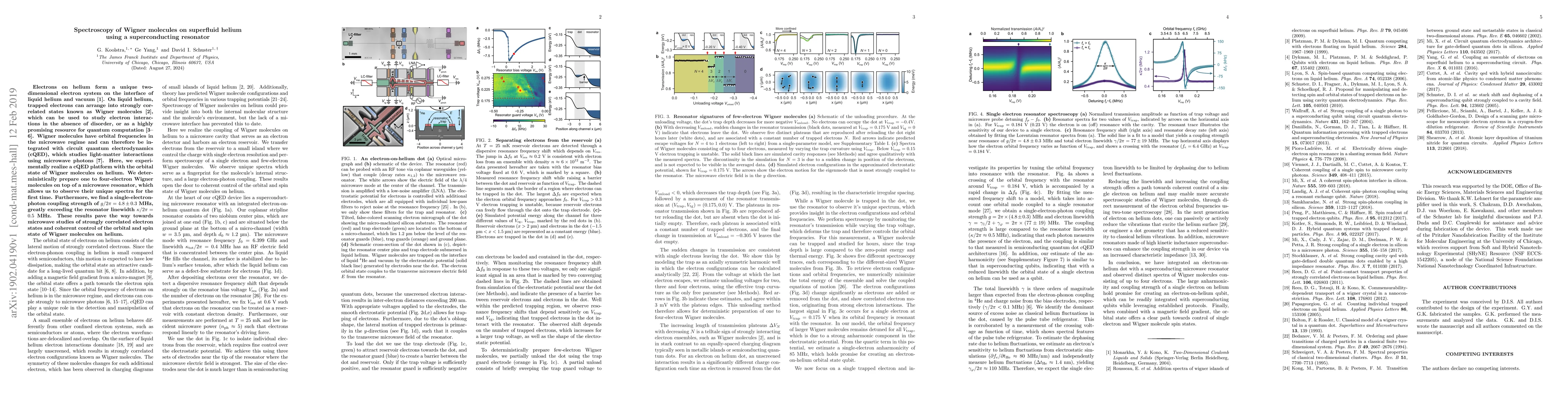 This paper reports the experimental realization of a circuit quantum electrodynamics platform to study Wigner molecules on superfluid helium, integrating them with a superconducting resonator. The researchers observe the unique spectra of one to four-electron Wigner molecules for the first time, achieving a significant single-electron-photon coupling strength that exceeds the resonator linewidth.