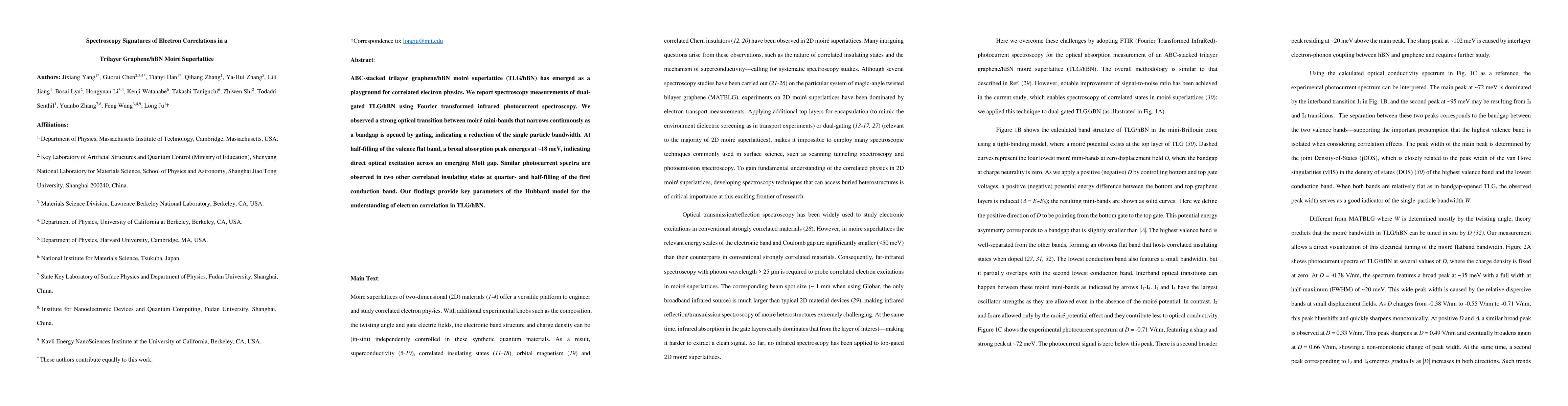 The study reports spectroscopy of trilayer graphene/hBN moiré superlattices revealing strong optical transitions and the emergence of a Mott gap at specific fillings, providing insights into electron correlations in the system. The observations support the Hubbard model parameters for understanding correlated electron behavior.
