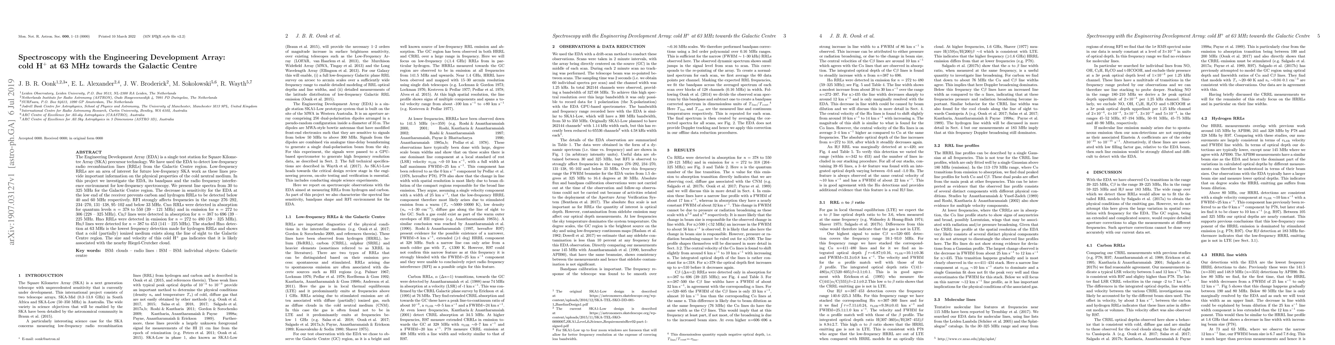 The Engineering Development Array (EDA) detected low-frequency radio recombination lines (RRLs) from the Galactic Centre, revealing cold H$^{+}$ at 63 MHz. This detection indicates the presence of a cold, partially ionized medium likely associated with the nearby Riegel-Crutcher cloud.