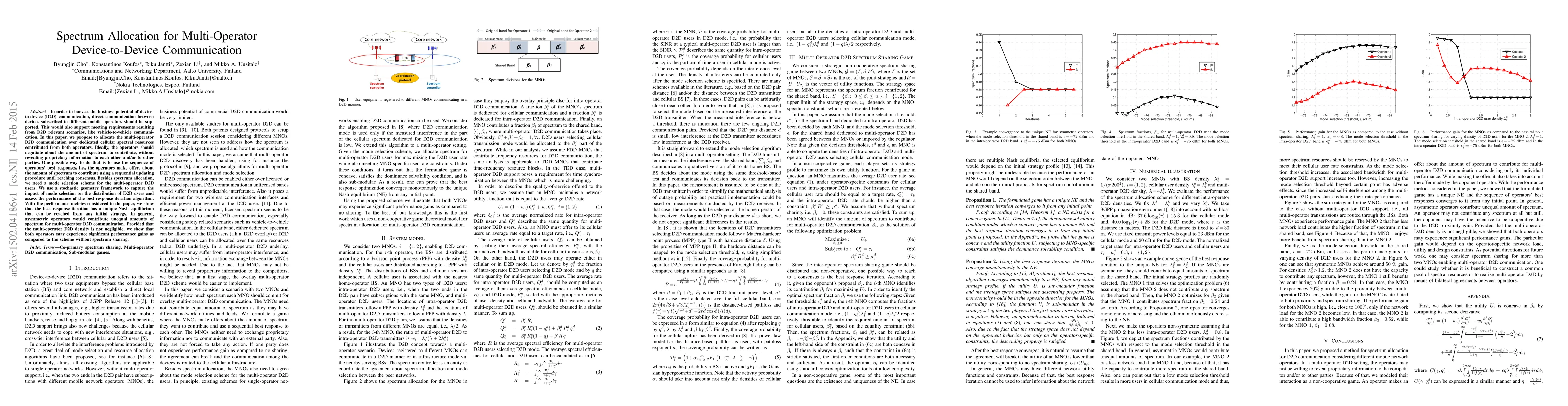 This paper proposes a spectrum allocation method for multi-operator device-to-device (D2D) communication, where operators contribute dedicated spectral resources. The best response iteration algorithm is used to negotiate spectrum contributions without revealing proprietary information, leading to a unique Nash equilibrium. The study also assesses the impact of mode selection on D2D user distribution and shows performance gains for both operators through spectrum sharing.