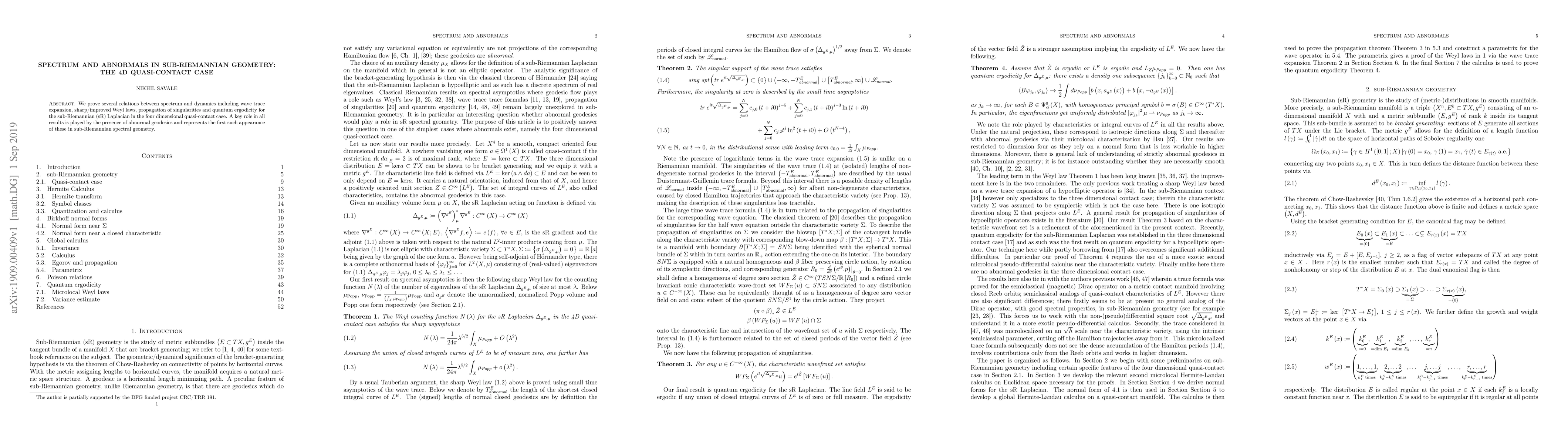 This paper establishes connections between spectral properties and dynamics for the sub-Riemannian Laplacian in the 4D quasi-contact case, emphasizing the influence of abnormal geodesics, and presents improved Weyl laws and quantum ergodicity results. The study marks the first exploration of abnormal geodesics in sub-Riemannian spectral geometry.