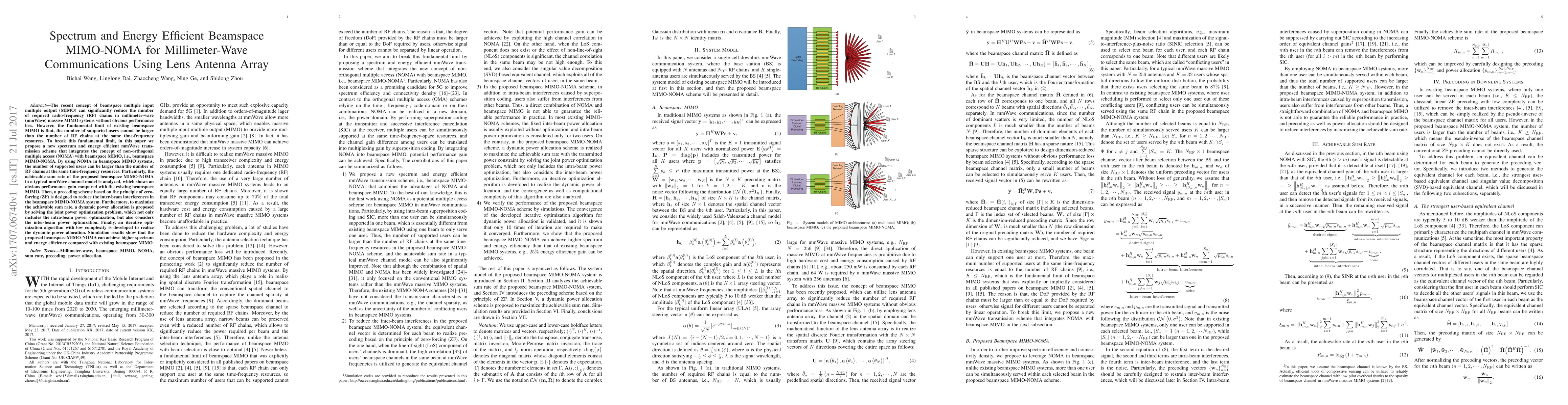 This paper proposes a spectrum and energy efficient beamspace MIMO-NOMA scheme for millimeter-wave communications using lens antenna arrays. The integration of NOMA with beamspace MIMO allows more users than RF chains, enhancing sum rate and efficiency over traditional beamspace MIMO.